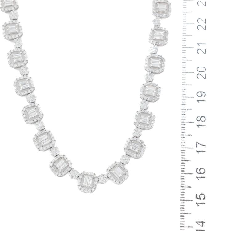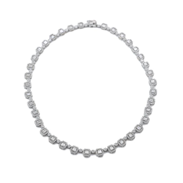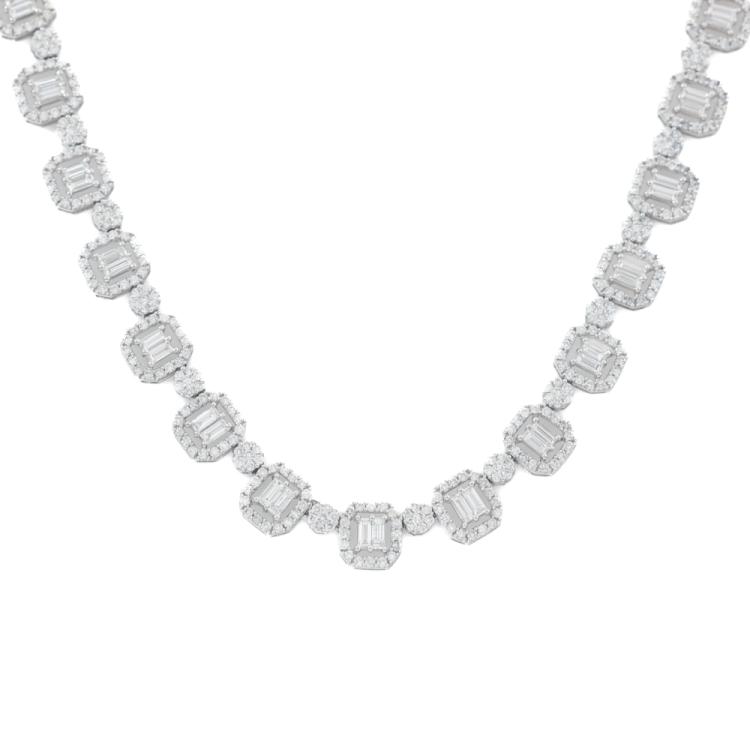 Diamond necklace with round & emerald cut Natural Diamonds totalling 10.00ct (Estimated grading: HIJ SI). 18ct white gold. Length: 42cm. Weight: 30.5g. With Valuation Certificate #420199. (Pre-owned)