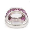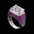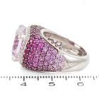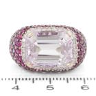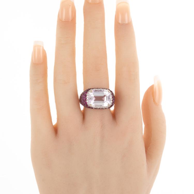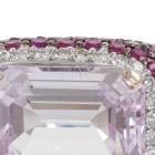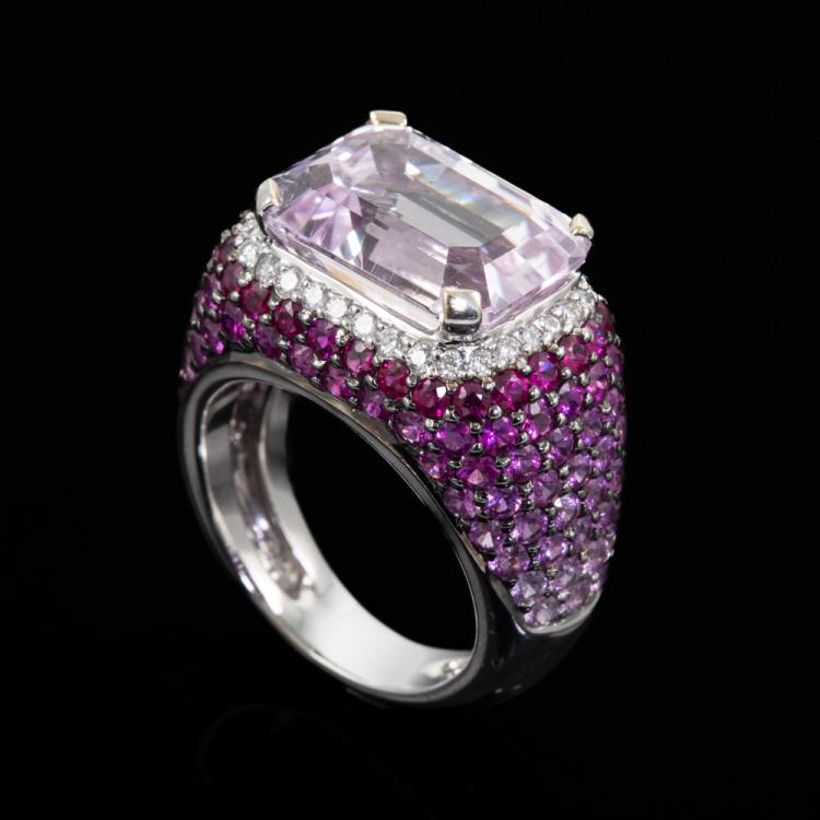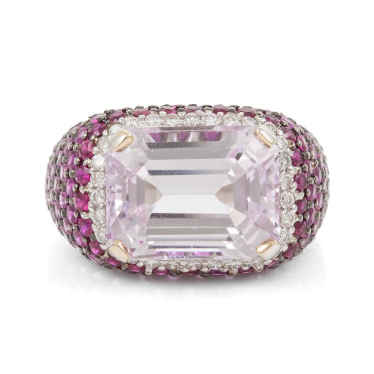 Kunzite and Sapphire ring with emerald cut Natural Kunzite of 10.04ct and round white & pink Natural Sapphire totalling 4.14ct. 18ct white gold. Ring size M1/2. Band width: 7.4mm - 4.6mm. Weight: 14.7g. (Pre-owned)