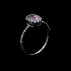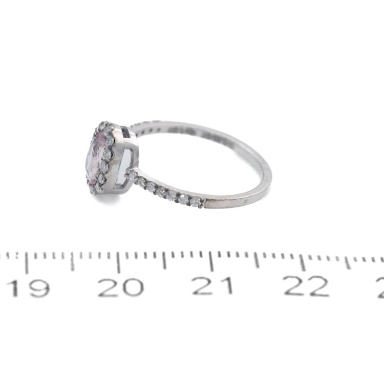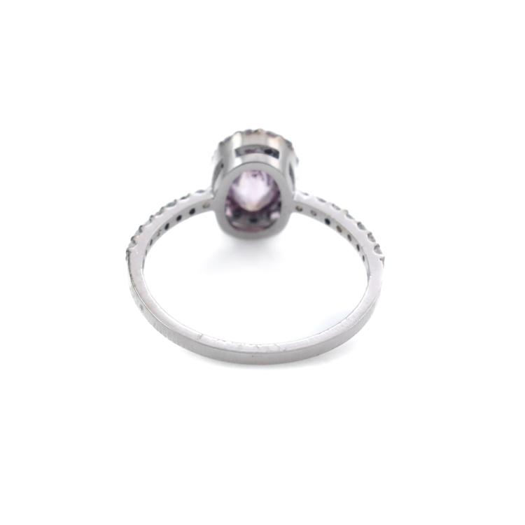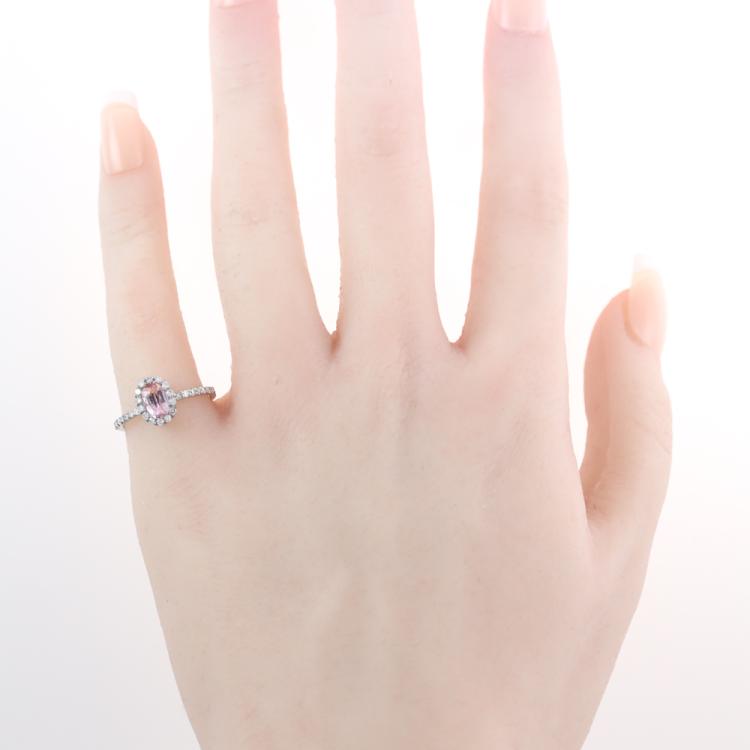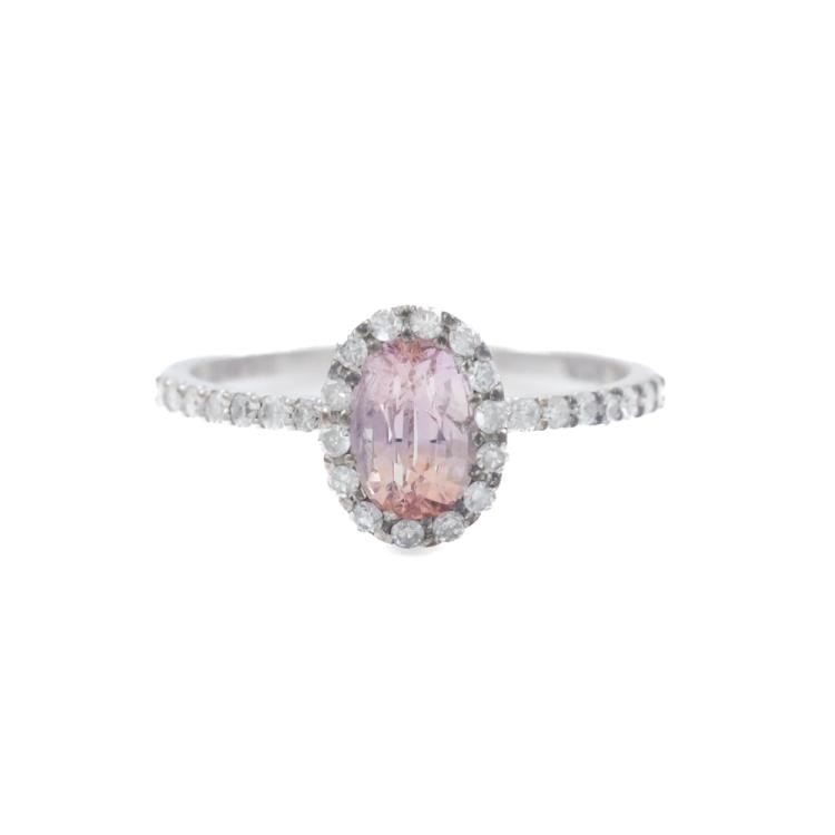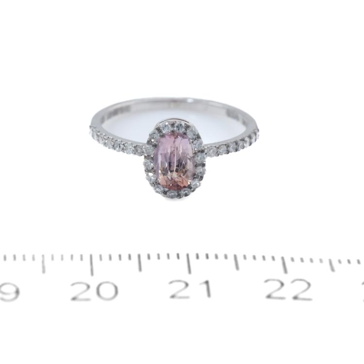 Sapphire and Diamond halo ring with an oval shape unheated Natural Ceylon Padparadscha Sapphire of 1.00ct and round Natural Diamonds totalling 0.33ct (Estimated grading: G-H SI). 14ct white gold. Ring size J1/4. With GGTL Report #209439. (As new)