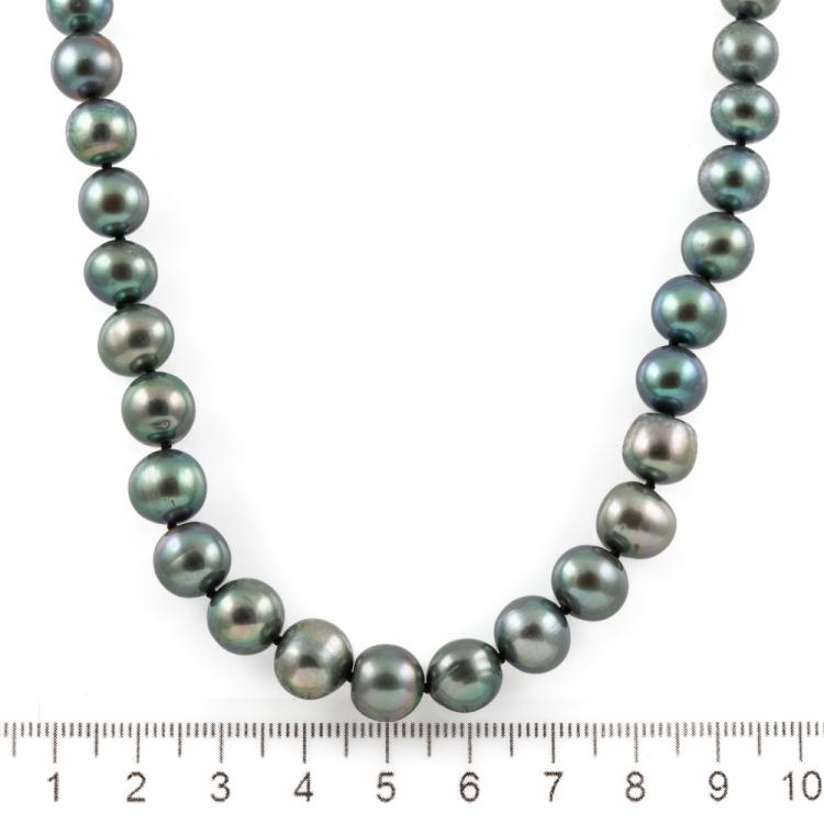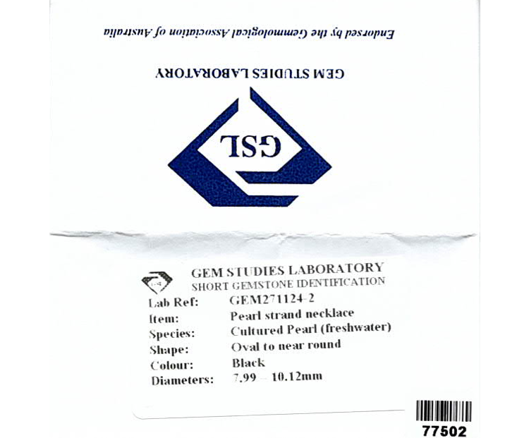 Pearl necklace with 50 graduated black Cultured Freshwater Pearls from 10.12mm - 7.99mm. 18ct yellow gold clasp. Length: 45.5cm. Weight: 45.4g. With GSL Memo # GEM271124-2. (As New)