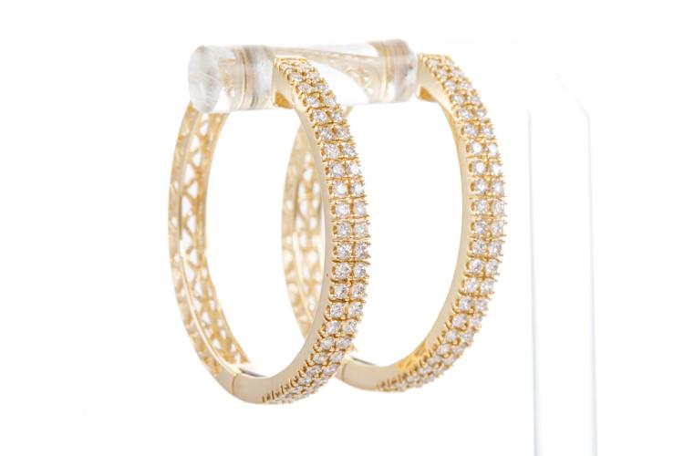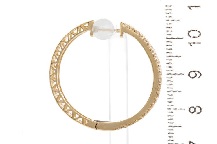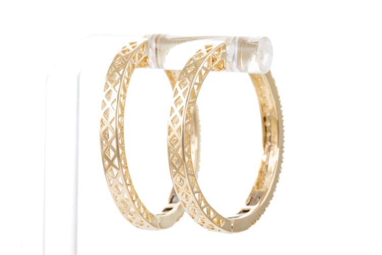 Diamond hoop earrings with 92 round Natural Diamonds totalling 1.01ct (Estimated grading: H-I SI-P1). 14ct yellow gold. Diameter: 30.0mm. Weight: 7.8g. (New).