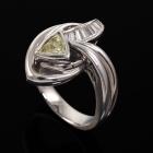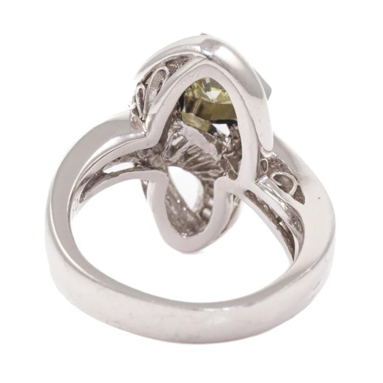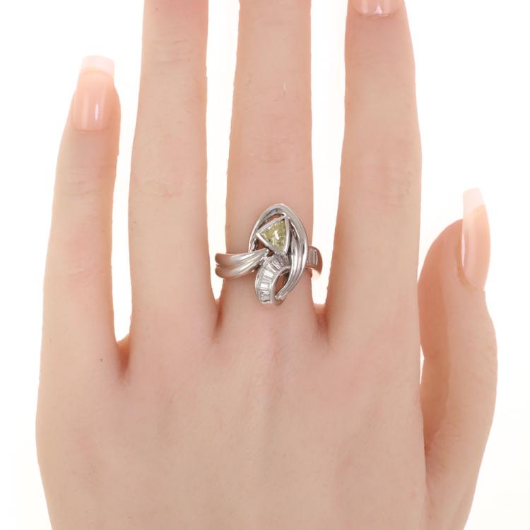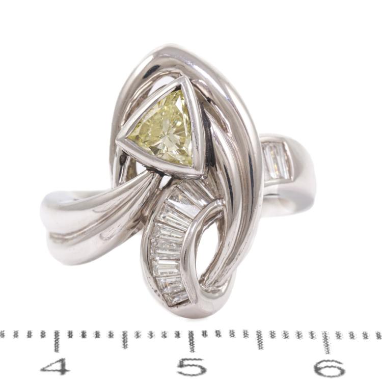 Diamond ring with trilliant cut Natural Diamond of 0.65ct (Estimated grading: Fancy Yellow VS) and baguette cut natural Diamonds totalling 0.36ct (Estimated grading: H SI). Platinum 900. Ring size: K1/2 - ring resizing is not recommended. Band width: 3.7mm-4.5mm. Weight: 13.8g. (Pre-owned)