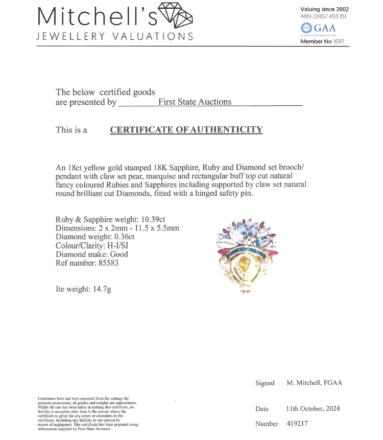 Flower bouquet brooch/pendant with pear shape, marquise & rectangular buff top cut blue & fancy colour Natural Sapphires and rubies totalling 10.39ct and round Natural Diamonds totalling 0.36ct (Estimated grading: H-I SI). 18ct yellow gold. Brooch size: 3.8cm x 3.1cm. Weight:14.7g. With Certificate #419217. (Pre-Owned)