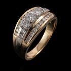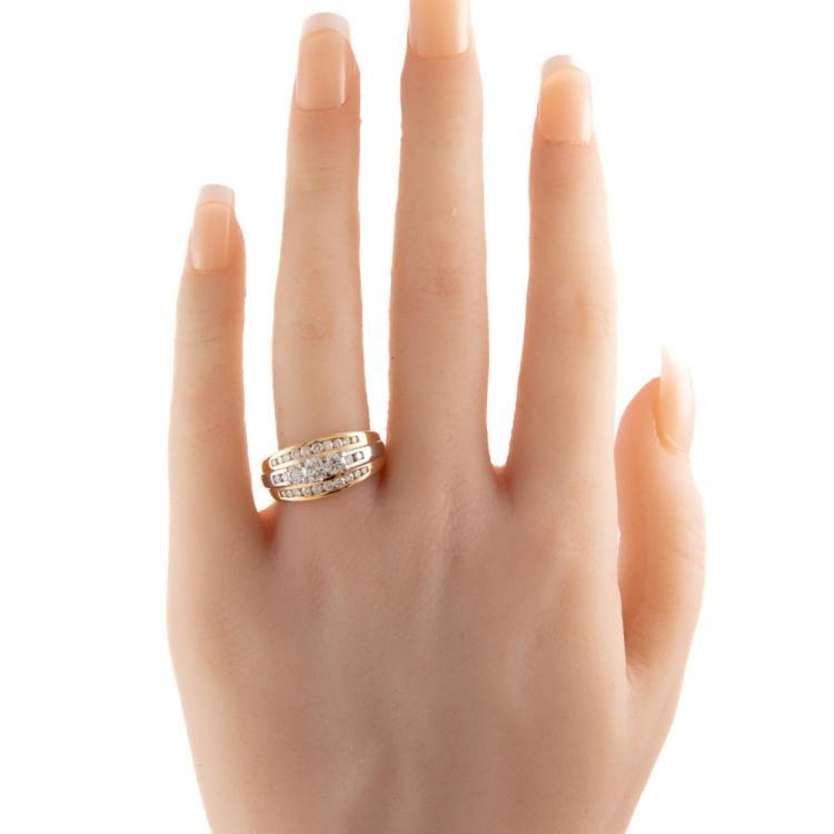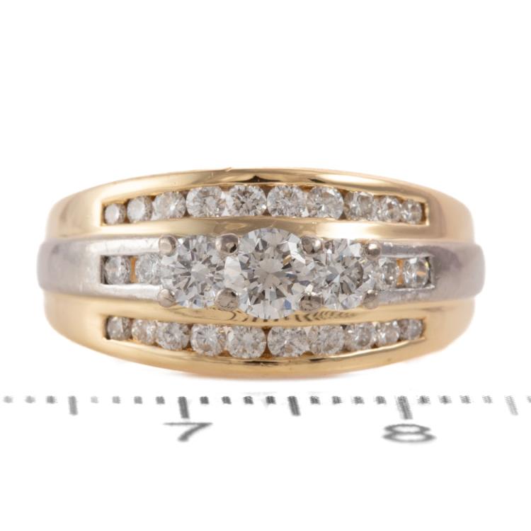 Diamond dress ring with a centre round Natural Diamond of 0.29ct and remaining Natural Diamonds totalling approximately 0.75ct (Estimated grading for all Diamonds: G-H SI). Inscribed "MHJ" inside band. 18ct yellow & white gold. Ring size O. Band width: 3mm-3.4mm. Weight: 9.5g. (Pre-owned)