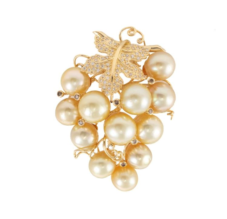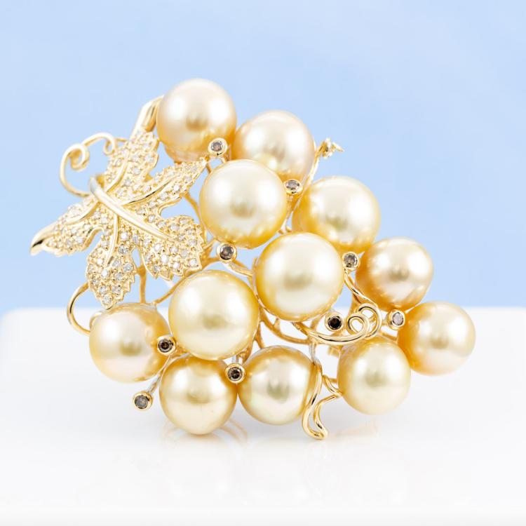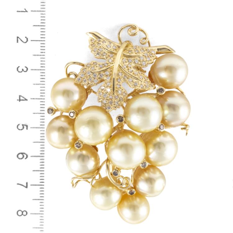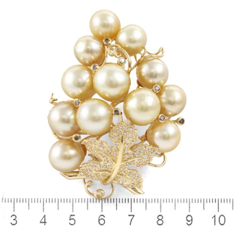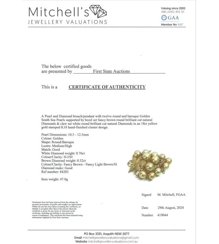 Pearl and Diamond Brooch/Pendant with 12 round & baroque Golden South Sea Pearls of 10.5mm-12.5mm and round Natural Diamonds totalling 0.76ct (Estimated grading: H-I SI) and remaining round Natural Diamonds totalling 0.32ct (Estimated grading: Fancy Brown - Fancy Light Brown SI.) 18ct yellow gold. Size: 4.7cm x 6.5cm. Weight: 47.0g. With Certificate #419044. (Pre-owned)
