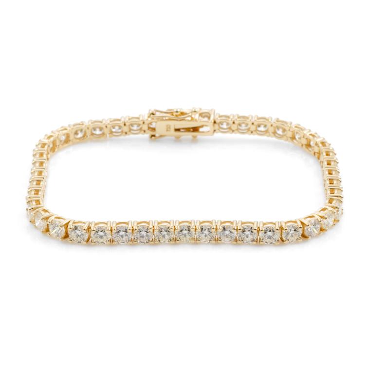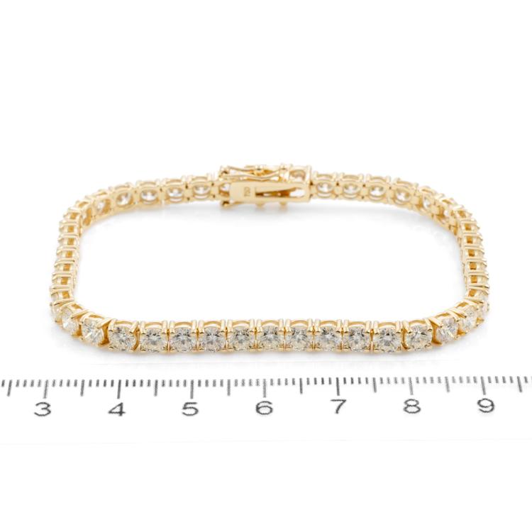 Diamond tennis bracelet with 44 round brilliant cut Natural Diamonds totalling 10.57ct (Estimated grading: J-K VS). 18ct yellow gold. Length: 18cm. Weight: 13.9g. With Valuation Certificate #418449. (New)