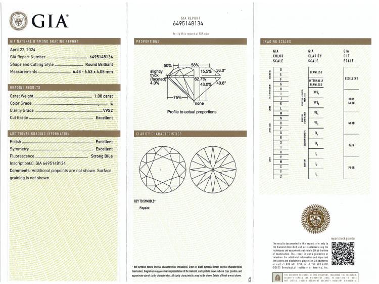 A loose round brilliant cut Natural Diamond of 1.08ct (with GIA Report graded as E VVS2 #6495148134). (New)