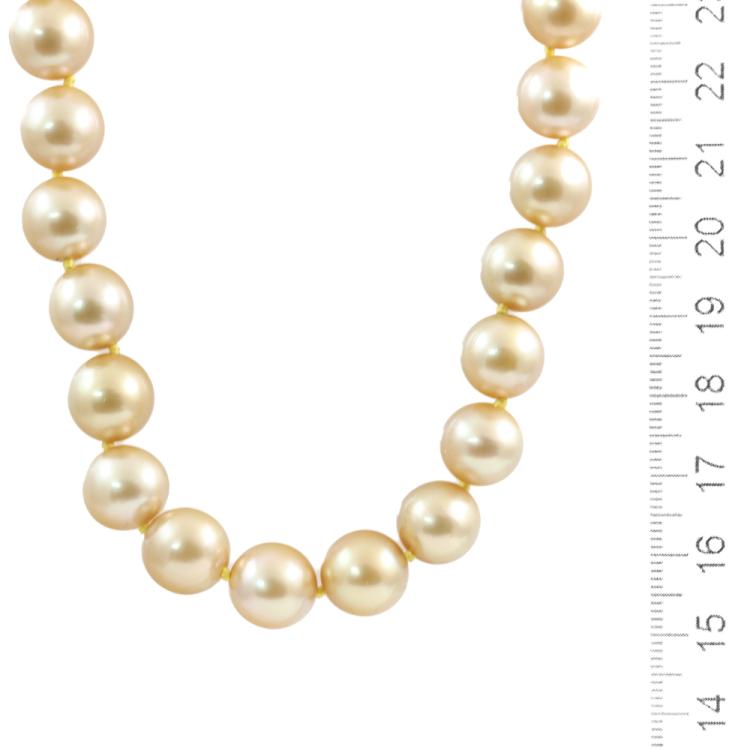 South Sea Pearl necklace with 38 Golden South Sea Pearls from 10.9mm - 10.0mm. 14ct yellow gold 10mm ball clasp. Length: 45.5cm. Weight: 63.6g. (Pre-Owned)