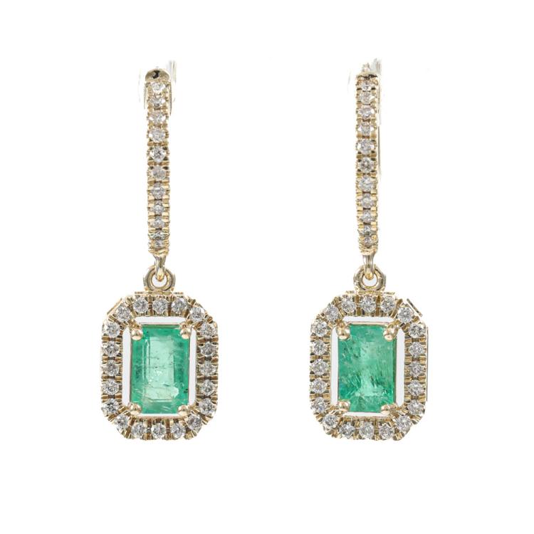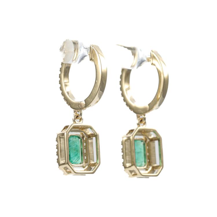 Emerald and Diamond drop earrings with emerald cut Natural Emeralds totalling 1.09ct and round Natural Diamonds totalling 0.43ct (Estimated grading: H-J SI). 14ct yellow gold. Weight: 4.5g. (Pre-owned)