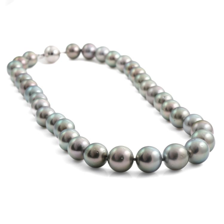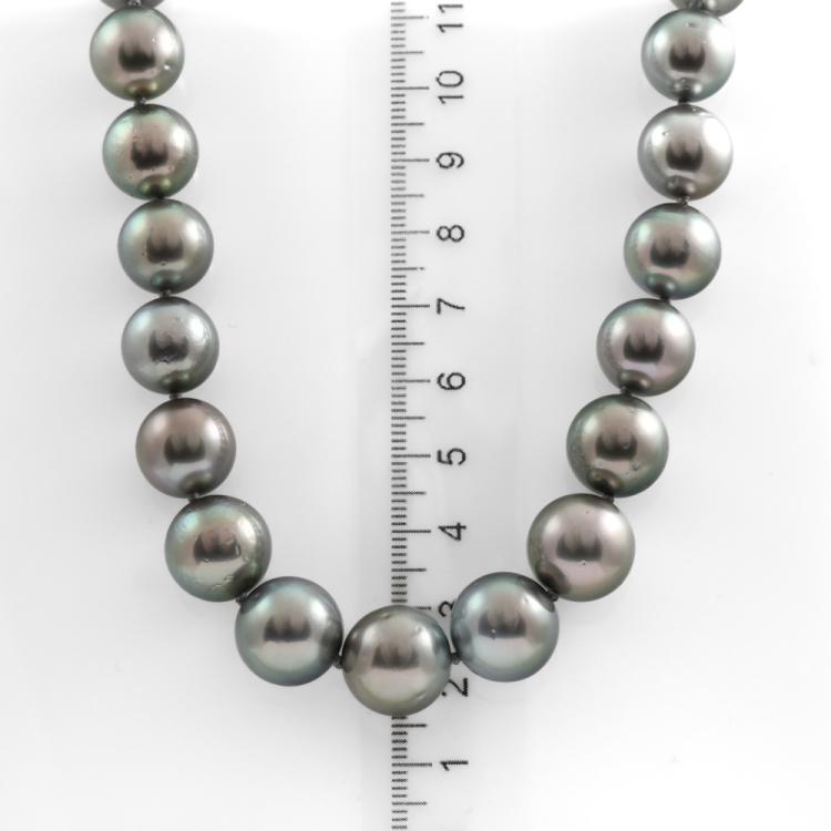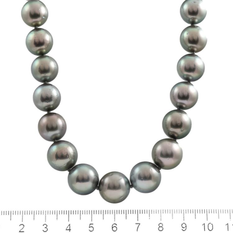 Pearl necklace with 35 graduated Tahitian Pearls of 11mm - 13.9mm. 14ct white gold ball clasp of 12mm. Length: 48cm. Weight: 93.7g. (Pre-owned)
