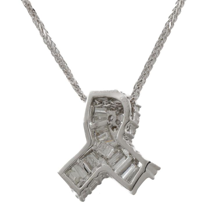 Ribbon design pendant with round & baguette cut Natural Diamonds totalling approximately 1.10ct (estimated grading: G-H VS-SI). 18ct white gold and 40cm 18ct white gold chain. Weight: 4.9g. (Pre-owned)