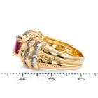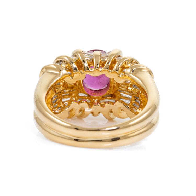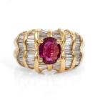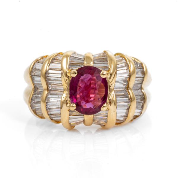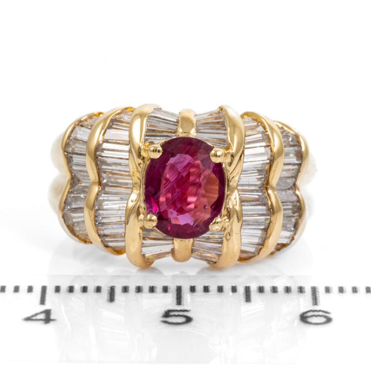 Ruby and Diamond ring with oval Natural Ruby of 1.11ct and baguette cut Natural Diamonds totalling 1.69ct (Estimated grading: H-I SI). 18ct yellow gold. Ring size J 1/2. Band width: 8.0mm - 3.7mm. Weight: 8.7g. (Pre-owned)