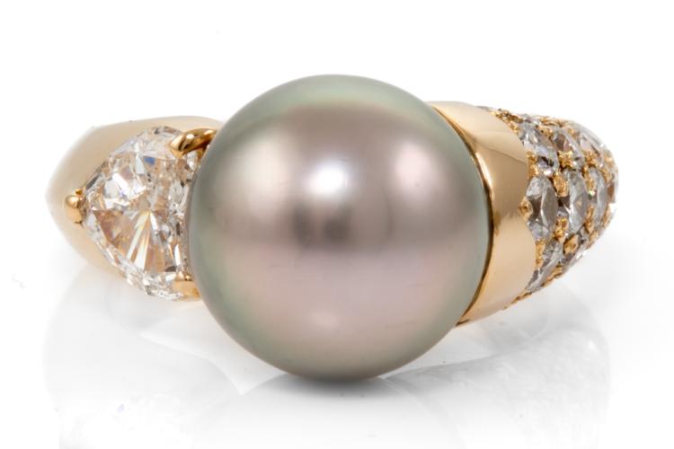 Pearl and Diamond ring with Tahitian Pearl of 11.1mm with heart shape and round Natural Diamonds totalling 0.49ct (Estimated grading: H-I SI). 18ct yellow gold. Ring size K. Weight: 9.2g. (Pre-owned)