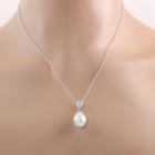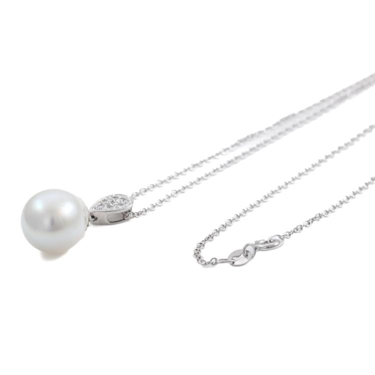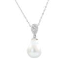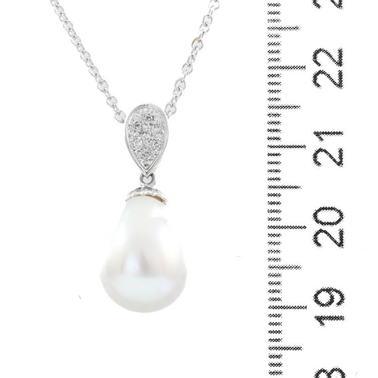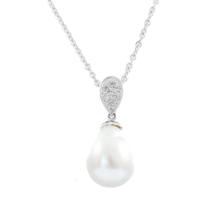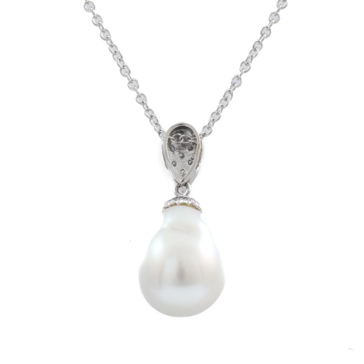 Pearl and Diamond pendant with baroque drop shape South Sea Pearl of 11.8mm and round Natural Diamonds totalling 0.05ct. 18ct white gold with 45.5cm 18ct white gold chain. Weight: 6.4g. (Pre-owned)