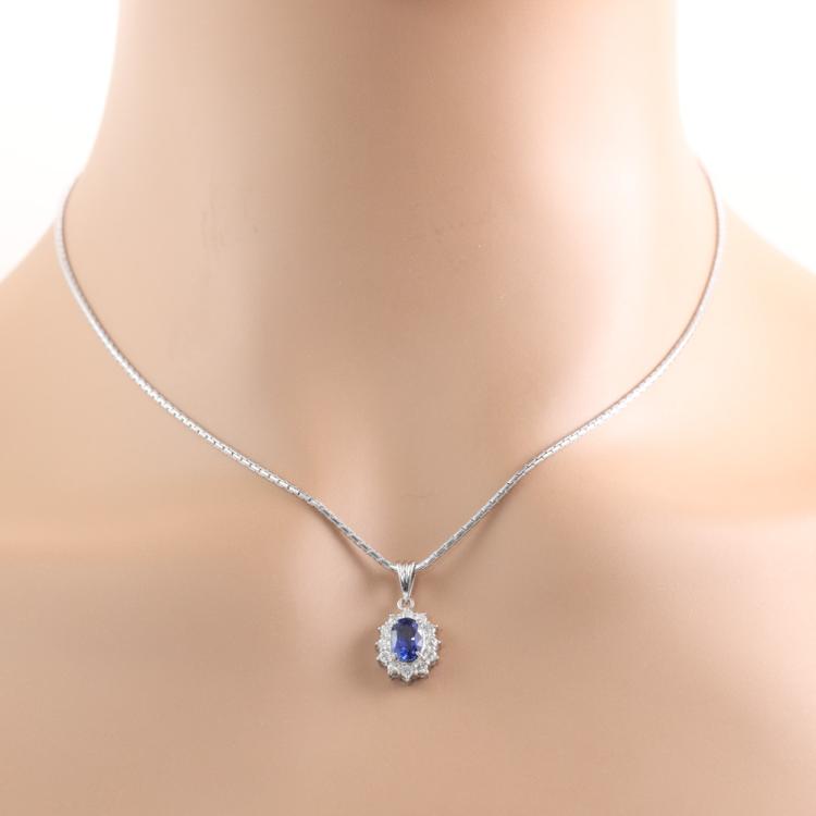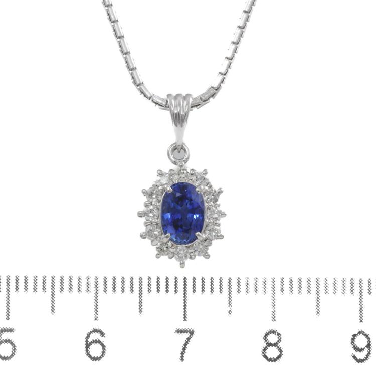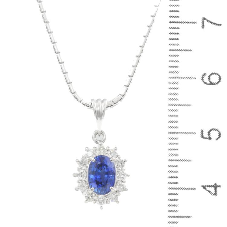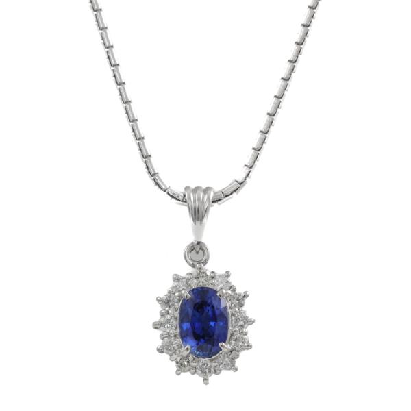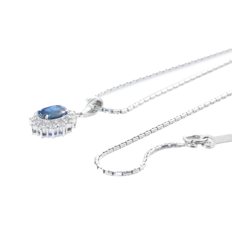 Sapphire and Diamond pendant with oval shape Natural Blue Sapphire of 1.19ct and round Natural Diamonds totalling 0.32ct (Estimated grading: H-J SI). Platinum - 900 (XRF tested, stamped "pt") with 41cm platinum 850 chain. Weight: 9.4g. (Pre-owned)