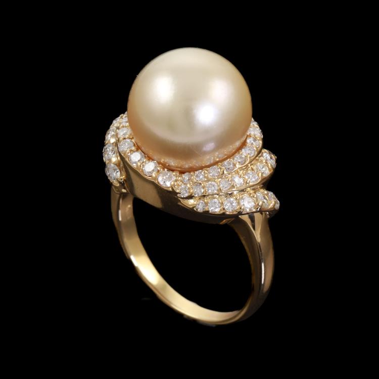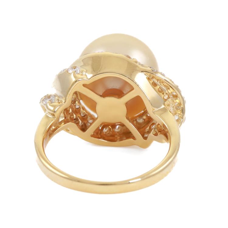 Pearl and Diamond ring with a golden South Sea Pearl of 11mm and round Natural Diamonds totalling 0.60ct (Estimated grading IJK SI) . 18ct yellow gold. Ring size I3/4. Band width: 1.8mm - 2.6mm. Weight: 8.0g. (Pre-owned)