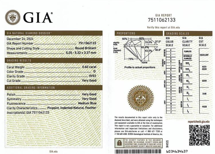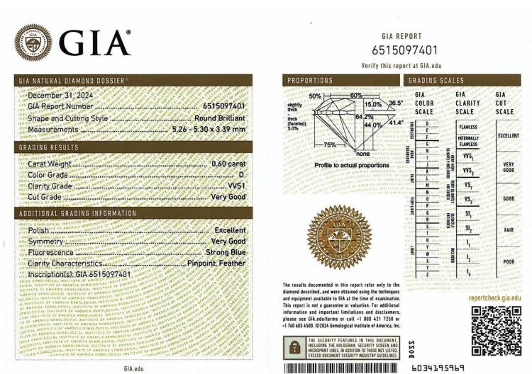 Diamond stud earrings with 2 round brilliant cut Natural Diamonds totalling 1.20ct (with GIA Dossier Reports graded as D VVS1 #6515097401, #7511062133). 18ct white gold. Weight: 1.4g. (New)