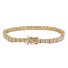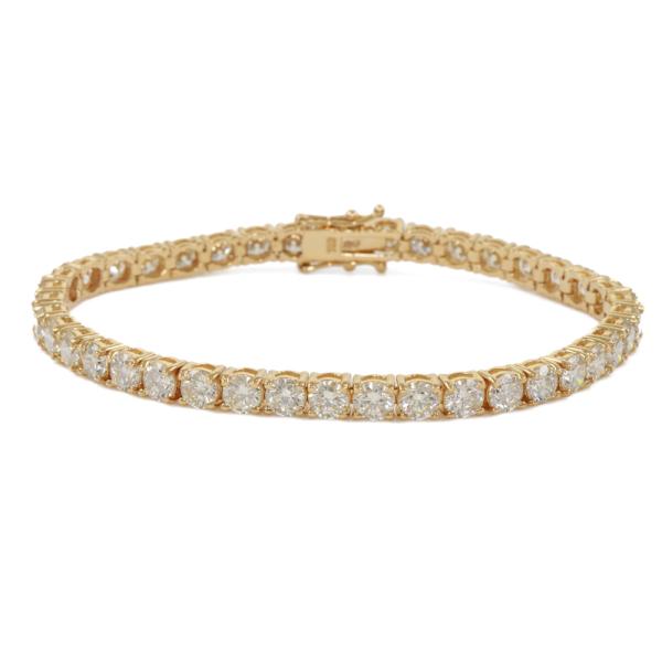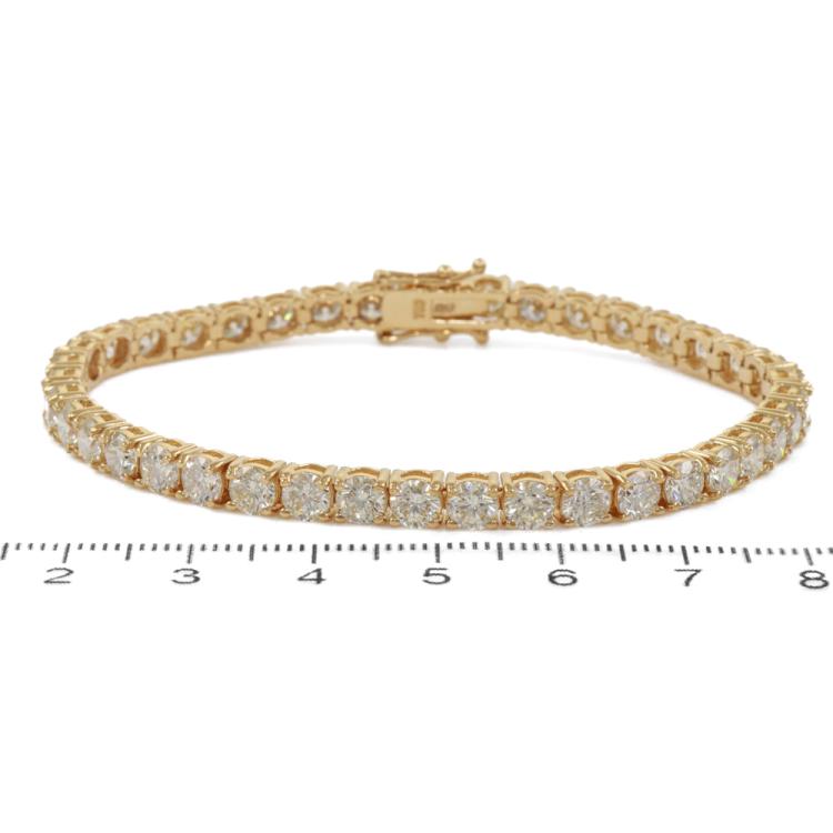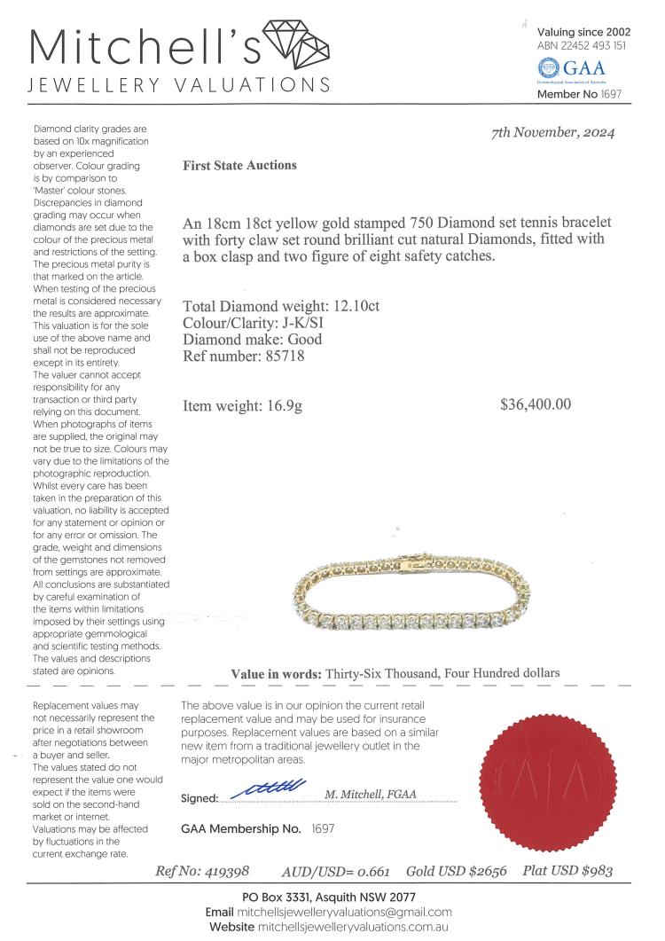 Diamond tennis bracelet with 40 round Natural Diamonds totalling 12.10ct (Estimated grading: J-K SI). 18ct yellow gold. Length: 18cm. Weight: 16.9g. With Valuation Certificate #419398. (New)