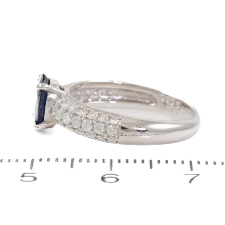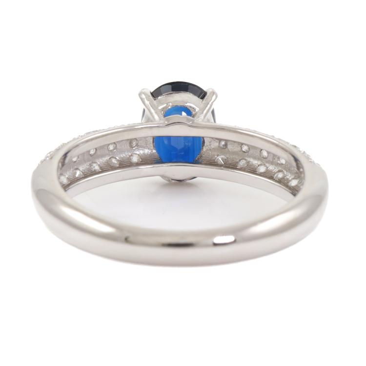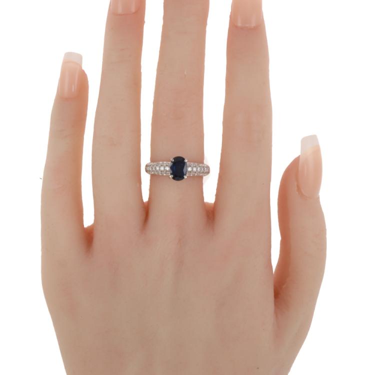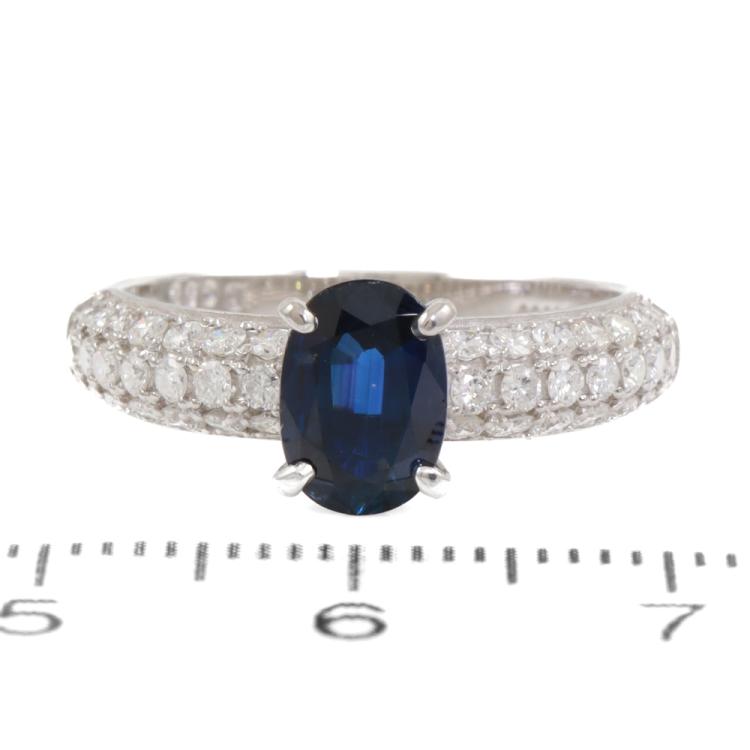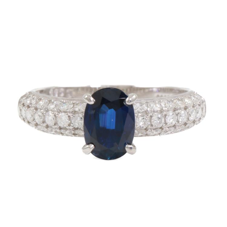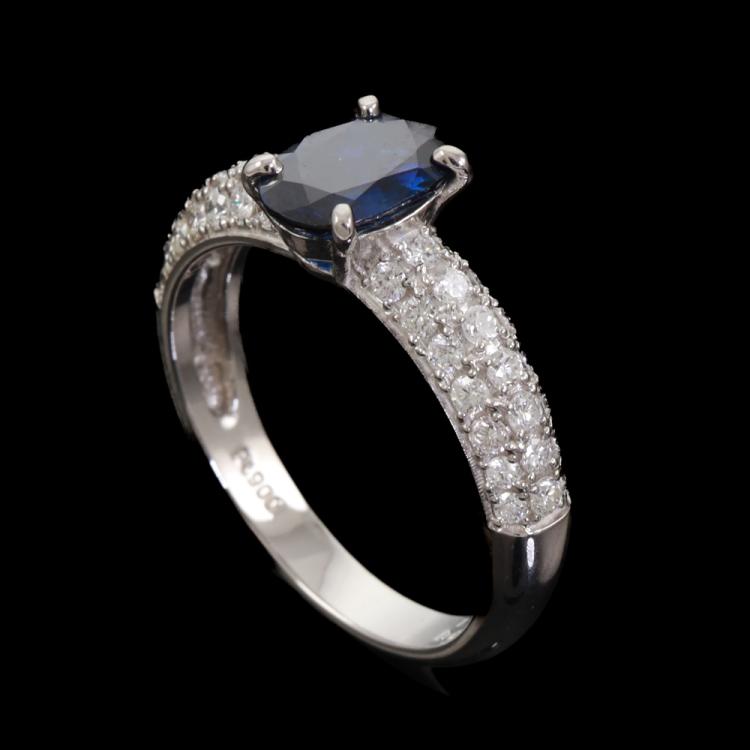 Sapphire and Diamond ring with oval shape Natural blue Sapphire of 1.21ct and round Natural Diamonds totalling 0.55ct (Estimated grading: G VS-SI). Platinum - 900. Ring size L1/2. Band width: 2.7mm - 3.8mm. Weight: 4.6g. (Pre-owned)