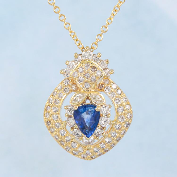 Sapphire and Diamond pendant with pear shape Natural blue Sapphire of 1.22ct and round & marquise cut Natural Diamonds totalling 1.71ct (Estimated Grading: I-K SI). 18ct yellow gold with 18ct gold 45cm chain. Weight: 8.8g. (Pre-owned)