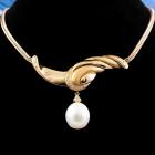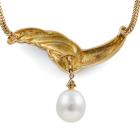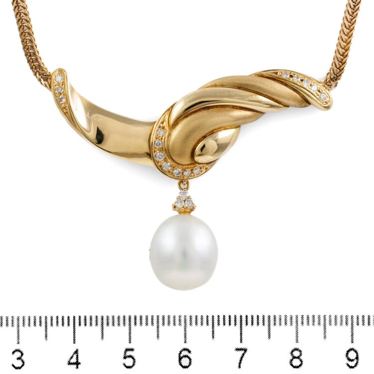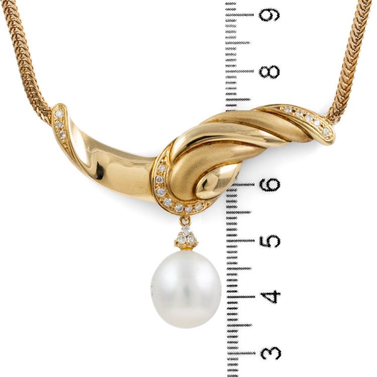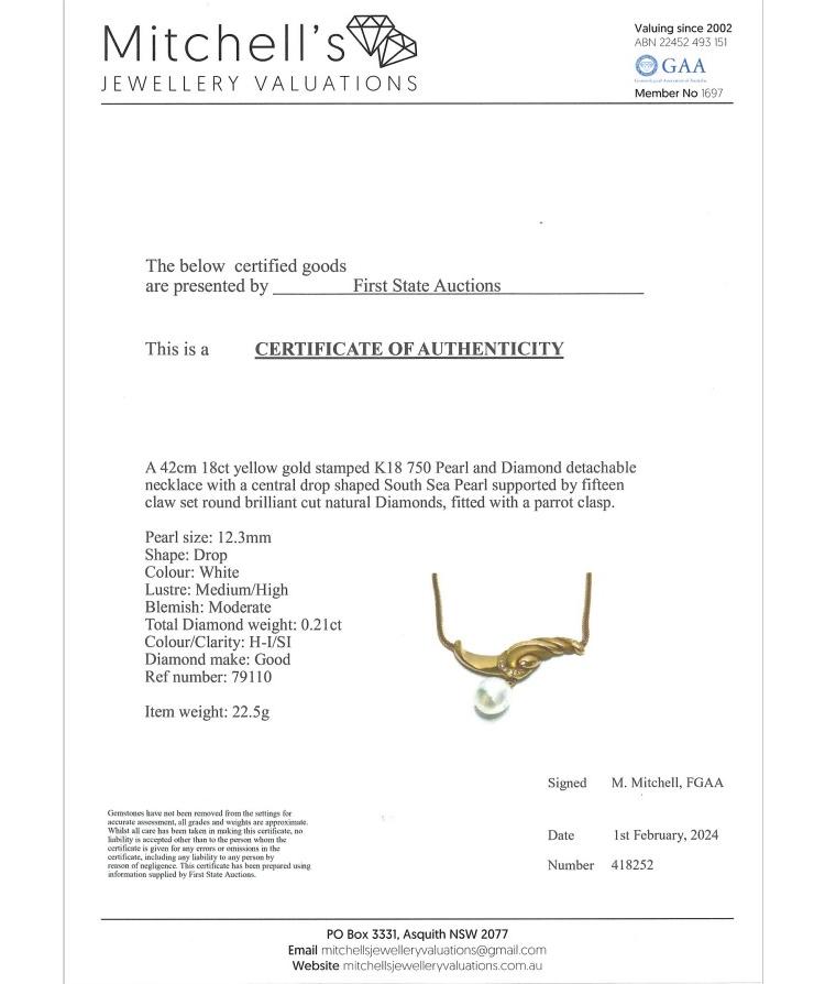 Pearl and Diamond detachable necklace with drop shape South Sea Pearl of 12.3mm and round Natural Diamonds totalling 0.21ct. 18ct yellow gold. Length: 42cm. Weight: 22.5g. With Certificate #418252. (Pre-owned)