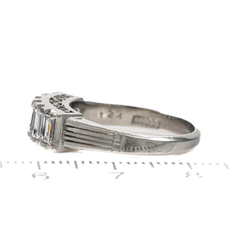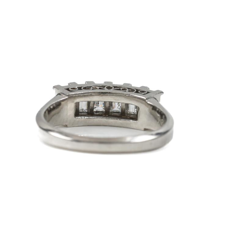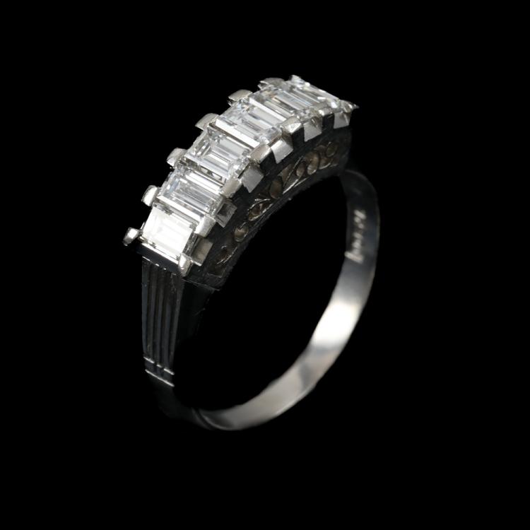 Diamond eternity ring with baguette cut Natural Diamonds totalling 1.24ct (Estimated grading: G VS). Platinum - 900. Ring size: N 1/4. Band width: 2.4mm - 3.3mm. Weight: 6.5g. (Pre-Owned)