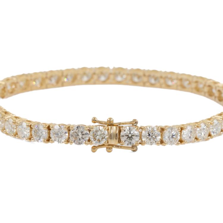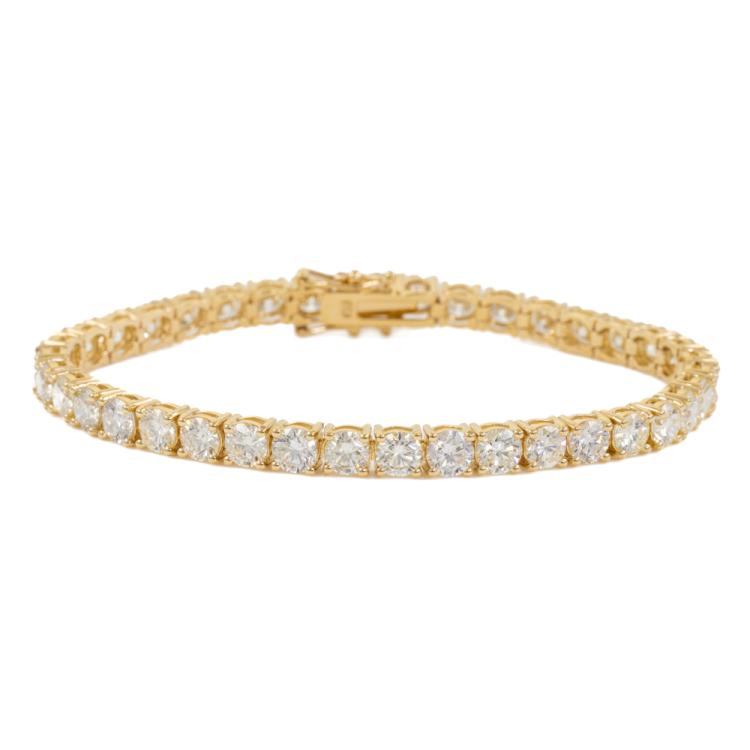 Diamond tennis bracelet with 38 round natural Diamonds totalling 12.57ct (Estimated grading: J-K VS). 18ct yellow gold. Length: 18cm. Weight: 16.6g. With Valuation Certificate #418910. (New)