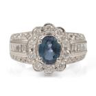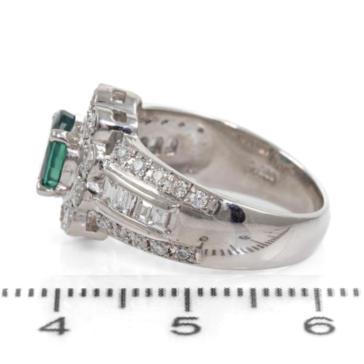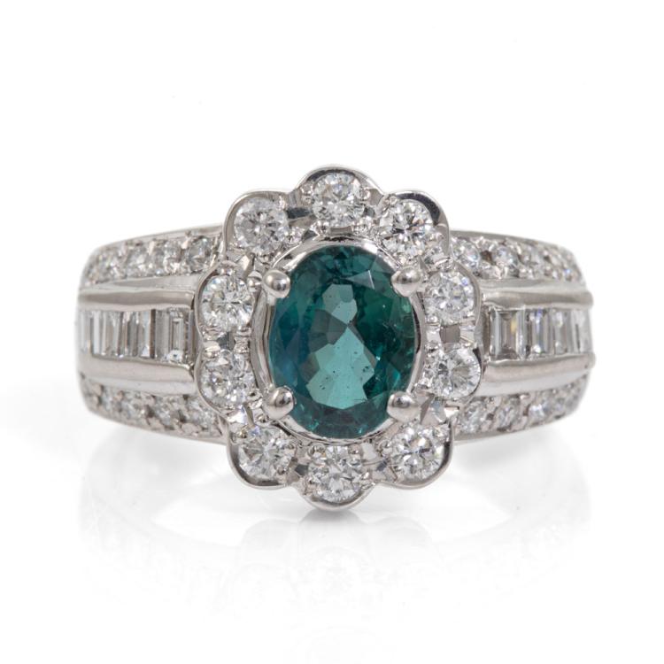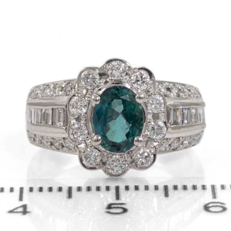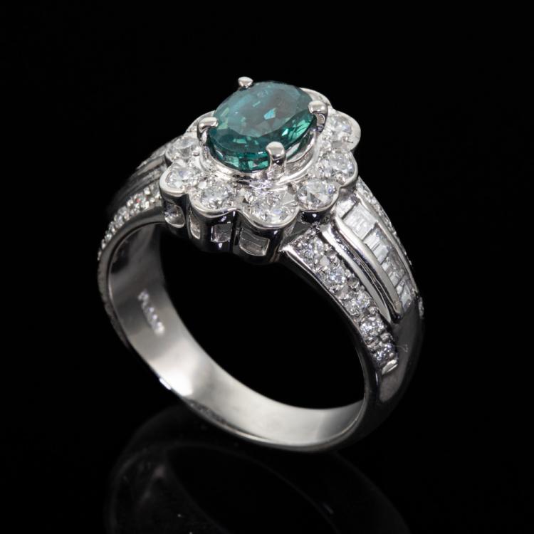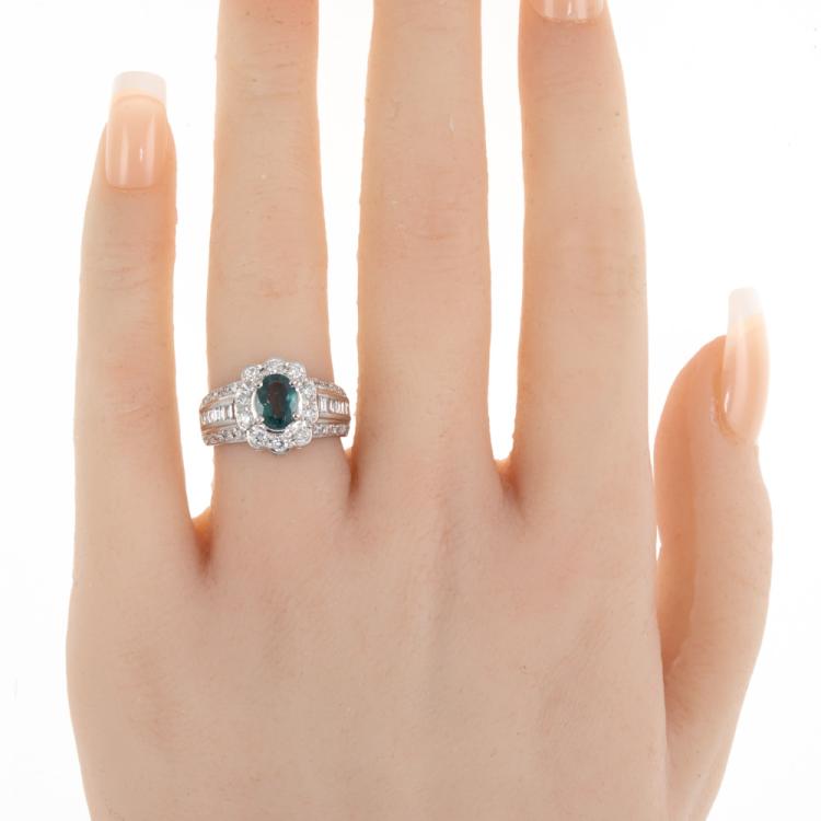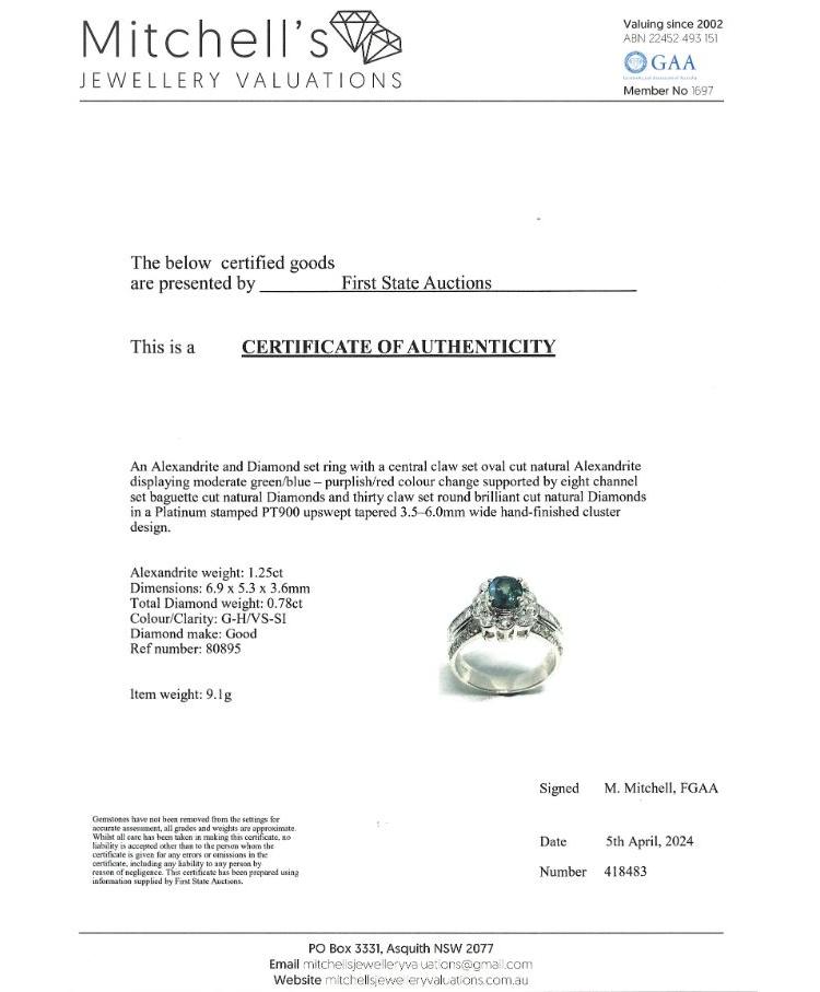 Alexandrite and Diamond ring with oval shape Natural Alexandrite of 1.25ct displaying colour change from blueish green to purple and round & baguette cut Natural Diamonds totalling 0.78ct (Estimated grading: G-H VS-SI). Platinum 900. Ring size K1/2 - ring resizing is not recommended. Band width: 3.5mm - 6mm. Weight: 9.1g. With Certificate #418483. (Pre-owned)