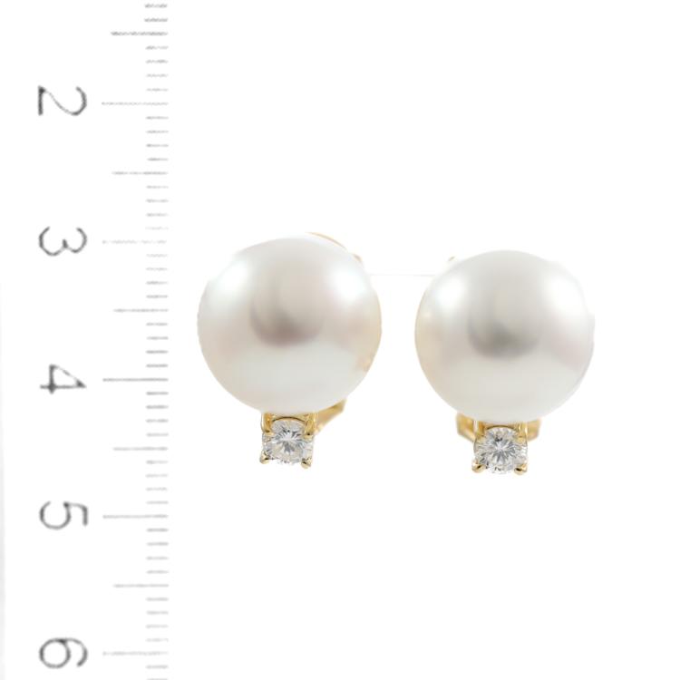 Pearl clip-on earrings (for pierced ears) with 2 South Sea Pearls of 12.8mm & 13.0mm and 2 round Natural Diamonds totalling 0.35ct (Estimated grading: G-H SI). 18ct yellow gold. Weight: 9.3g. (Pre-owned)