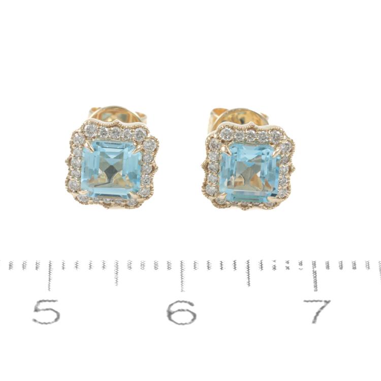 Topaz and Diamond earrings with square Natural Blue Topaz totalling 1.28ct and round Natural Diamonds totalling 0.15ct. 14ct yellow gold. Weight: 1.7g. (New)