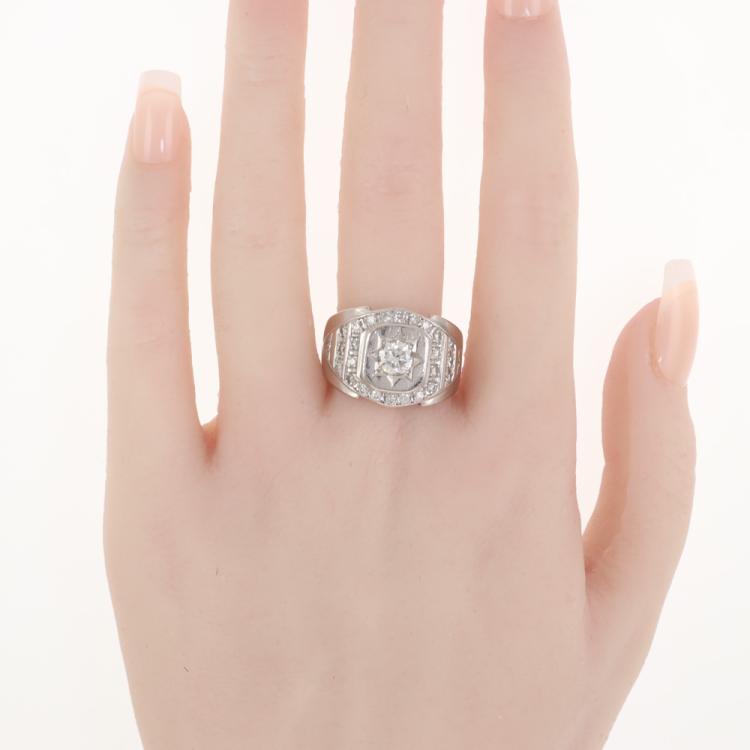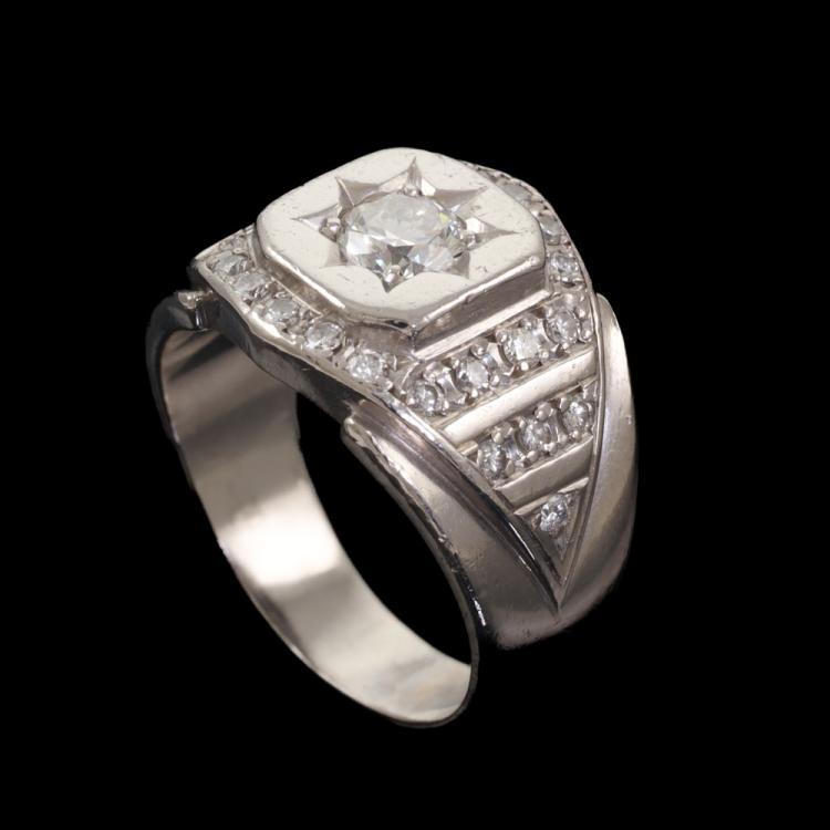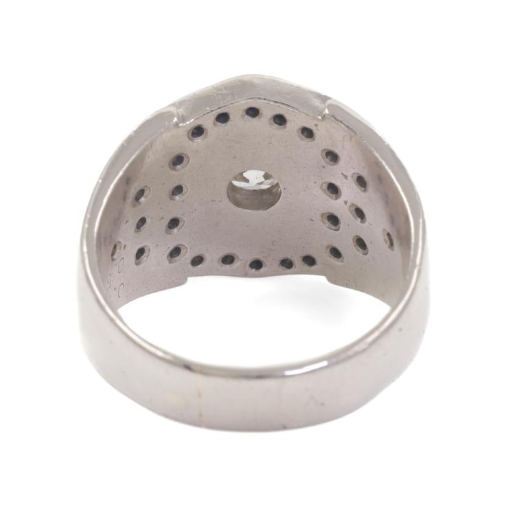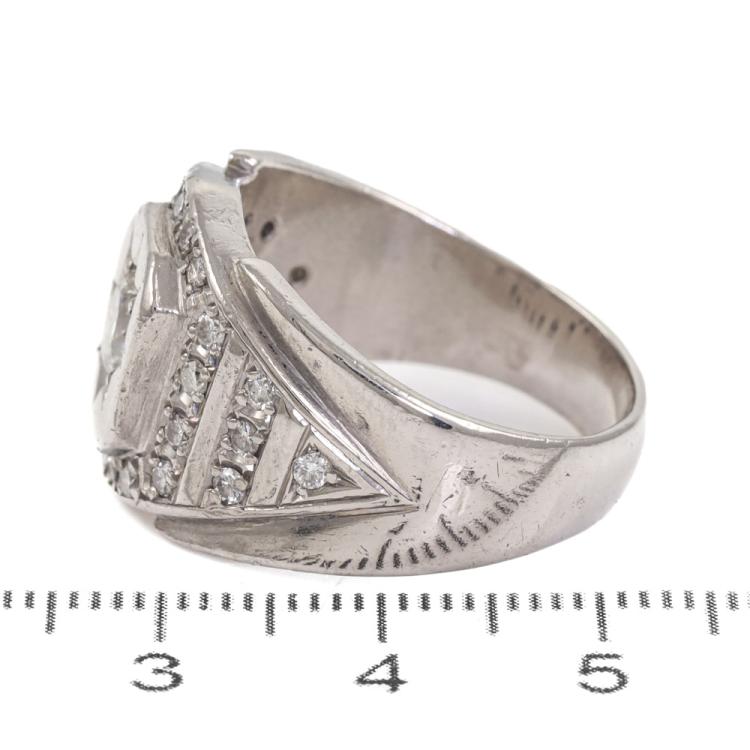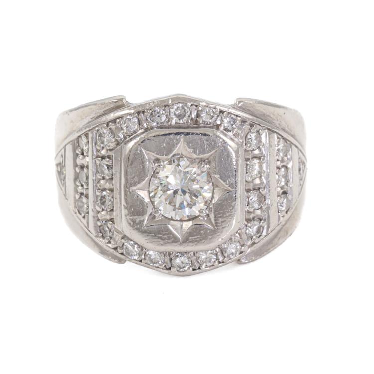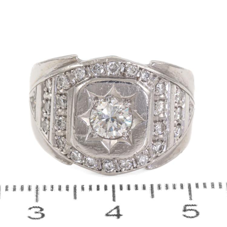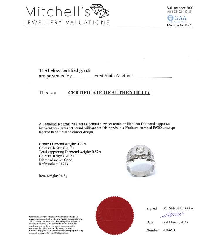Diamond mens ring with a centre round Natural Diamond of 0.72ct (Estimated grading G-H SI) and remaining round Natural Diamonds totalling 0.57ct (Estimated grading: G-H SI). Platinum-900. Ring size T1/2. Weight: 24.8g. With certificate #416650. (Pre-owned)