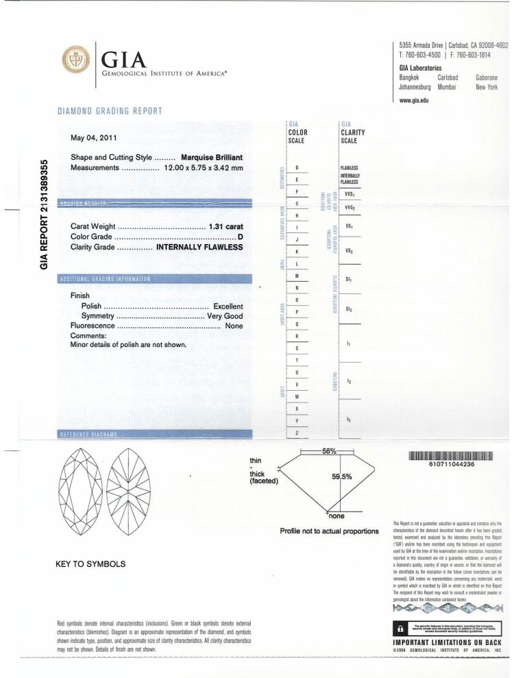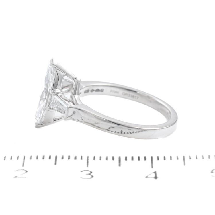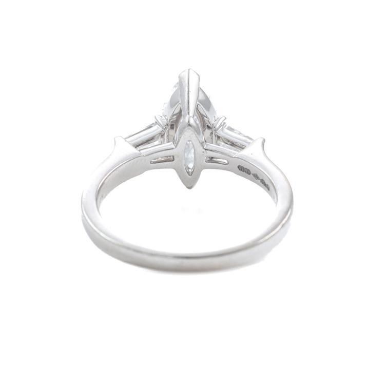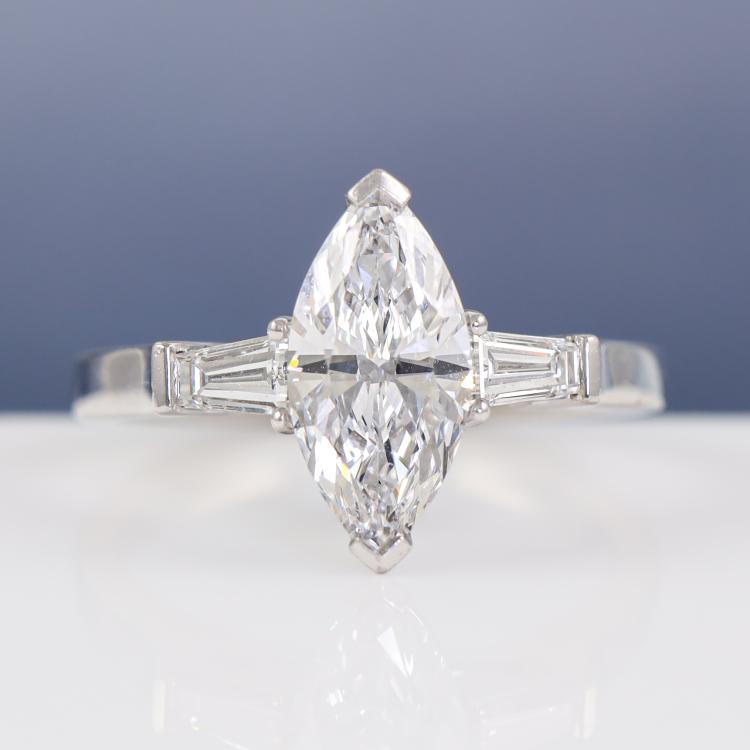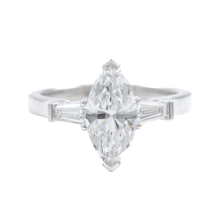 GRAFF Diamond solitaire ring with marquise cut Natural Diamond of 1.31ct (With GIA Report graded as D Internally Flawless #2131389355) and 2 baguette cut Natural diamonds totalling approximately 0.26ct. Platinum-950. Ring size J. Band width: 1.8mm - 2.2mm. Weight: 5.3g. With Graff box. (Pre-owned)