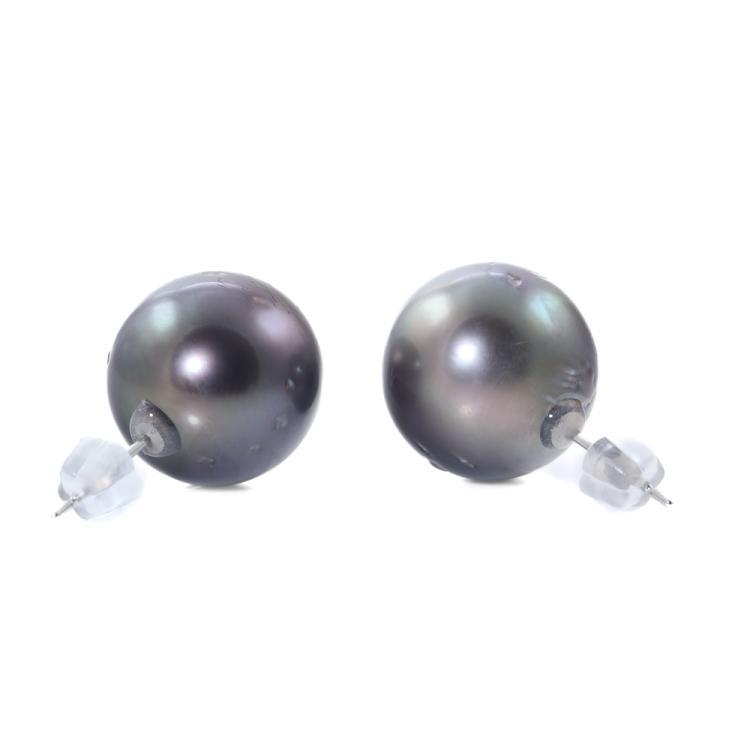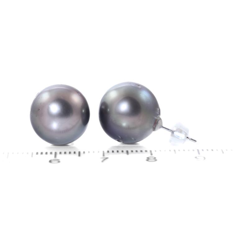 Pearl stud earrings with Tahitian Pearl of 13.2mm -13.3mm. 14ct white gold with 18ct white gold backs. Weight: 7.3g. (Pre-owned)