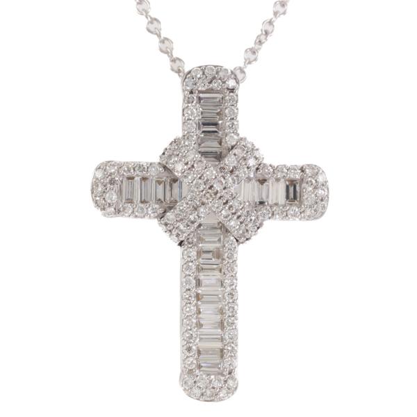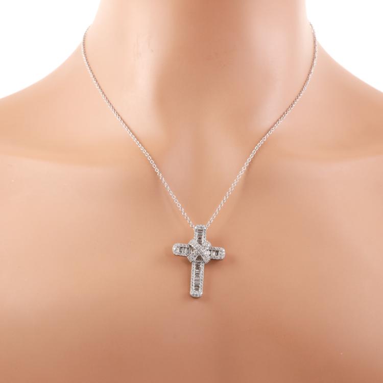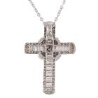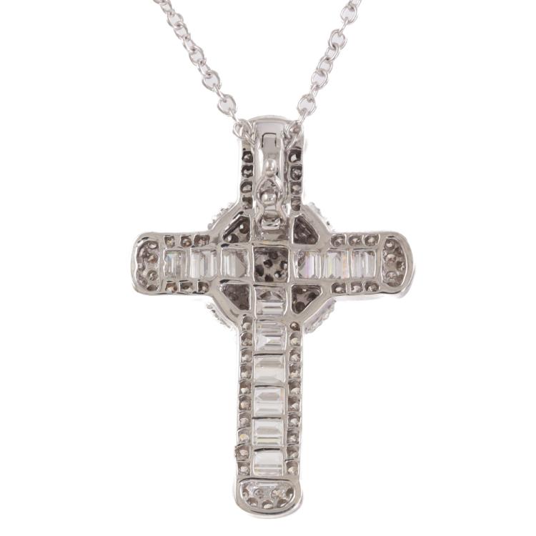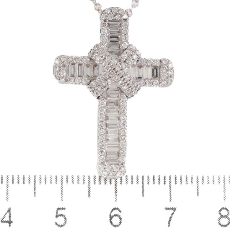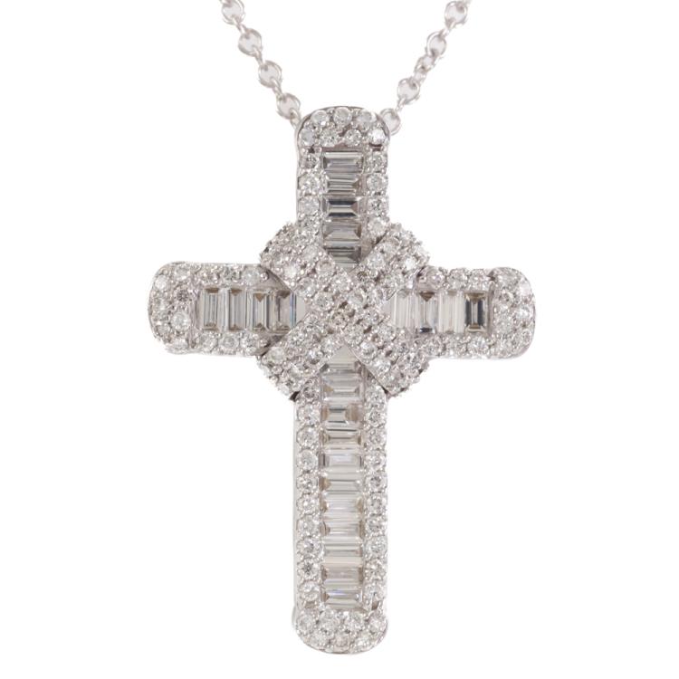 Diamond cross pendant with round & baguette cut Natural Diamonds totalling 1.33ct (Estimated grading: G-H VS-SI). 18ct white gold with 18ct white gold 45cm chain. Weight: 7.8g. (Pre-owned)