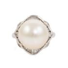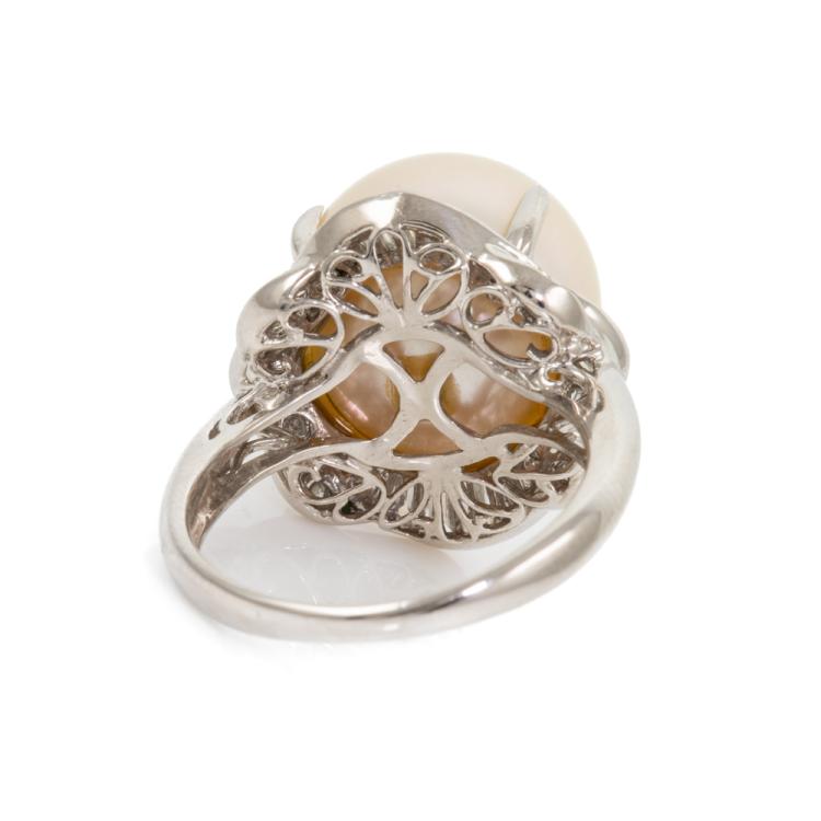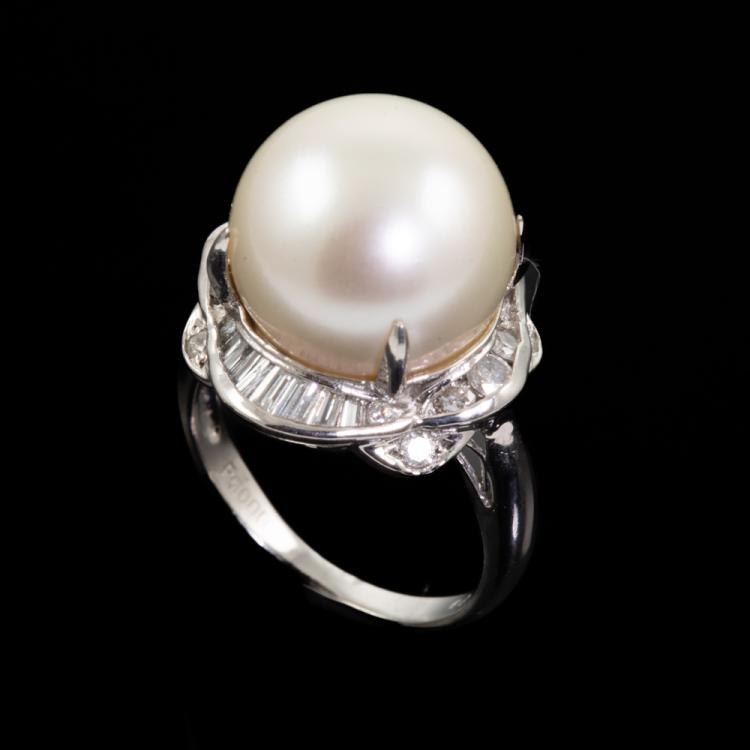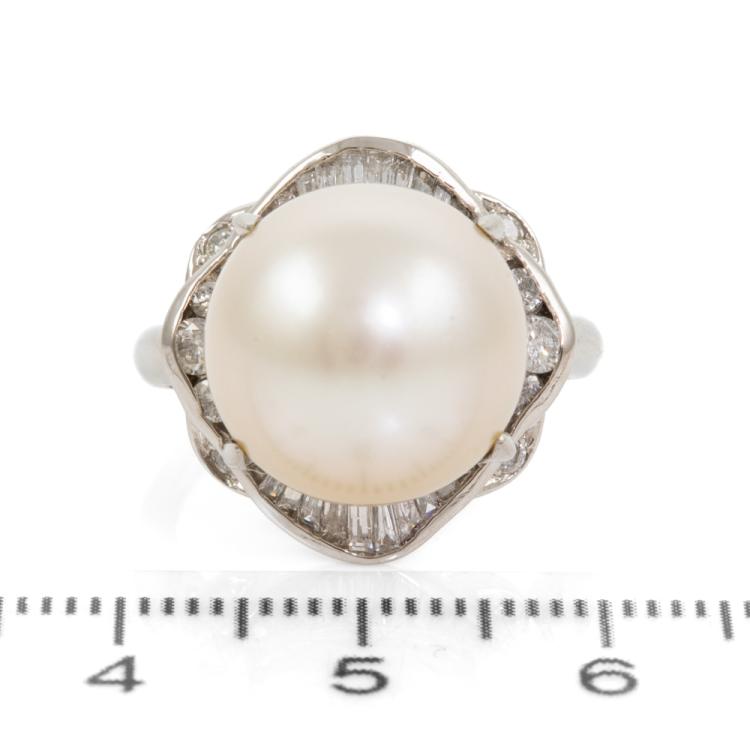Pearl and Diamond ring with South Sea Pearl of 13.4mm and round & baguette cut Natural Diamonds totalling 0.70ct (Estimated grading: H-I SI-P1). Platinum 1000. Ring size L. Band width: 1.9mm - 3.1mm. Weight: 11.2g. (Pre-owned)