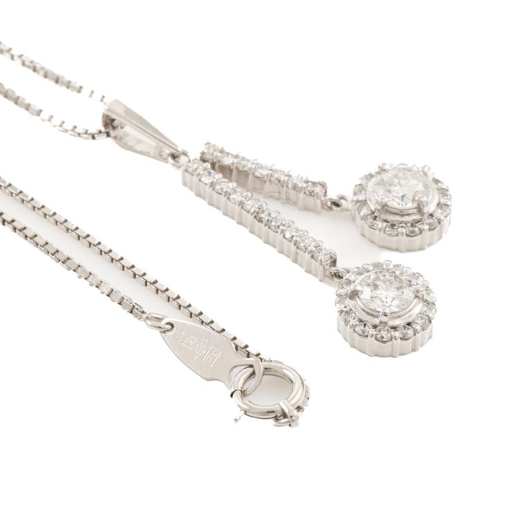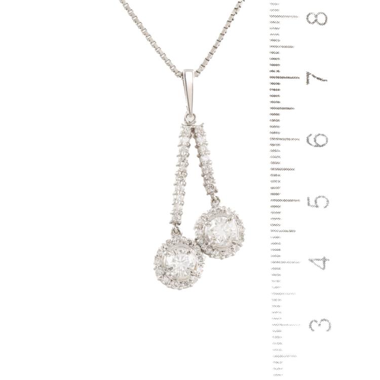 Diamond drop pendant with 2 round Natural Diamonds totalling approximately 0.72ct (Estimated grading H SI-P1) and surrounding round Natural Diamonds totalling approximately 0.63ct (Estimated grading: H-I SI). Platinum - 900 with 40cm Platinum 850 chain. Weight: 9.6g. (Pre-owned)