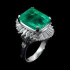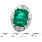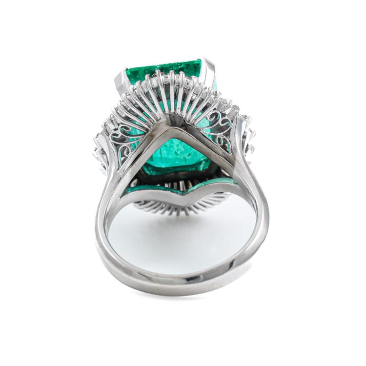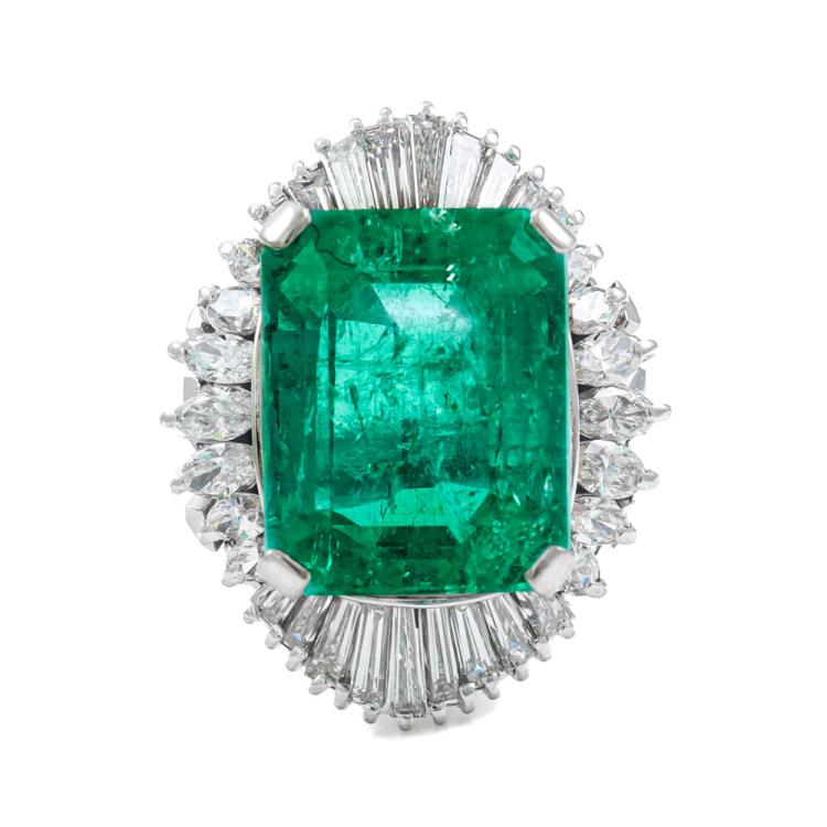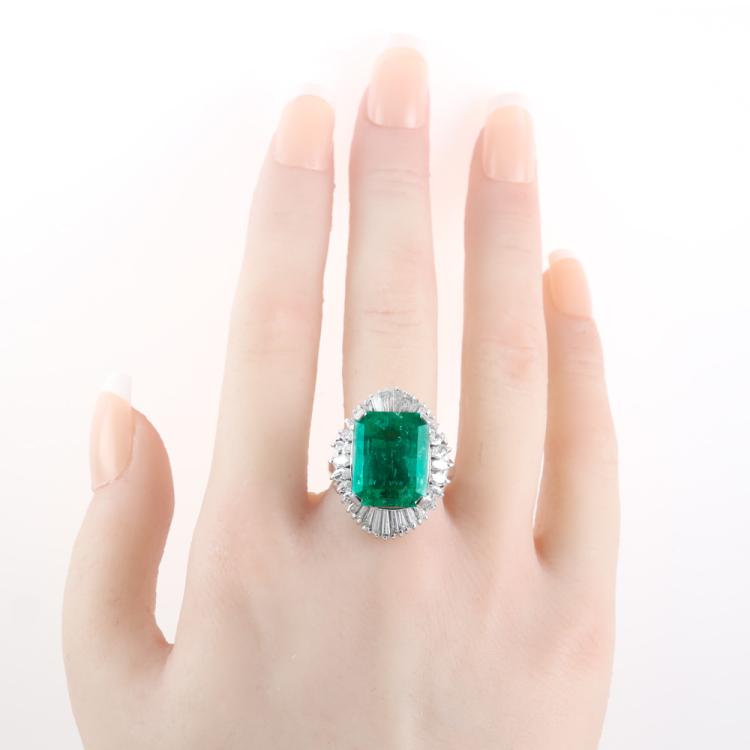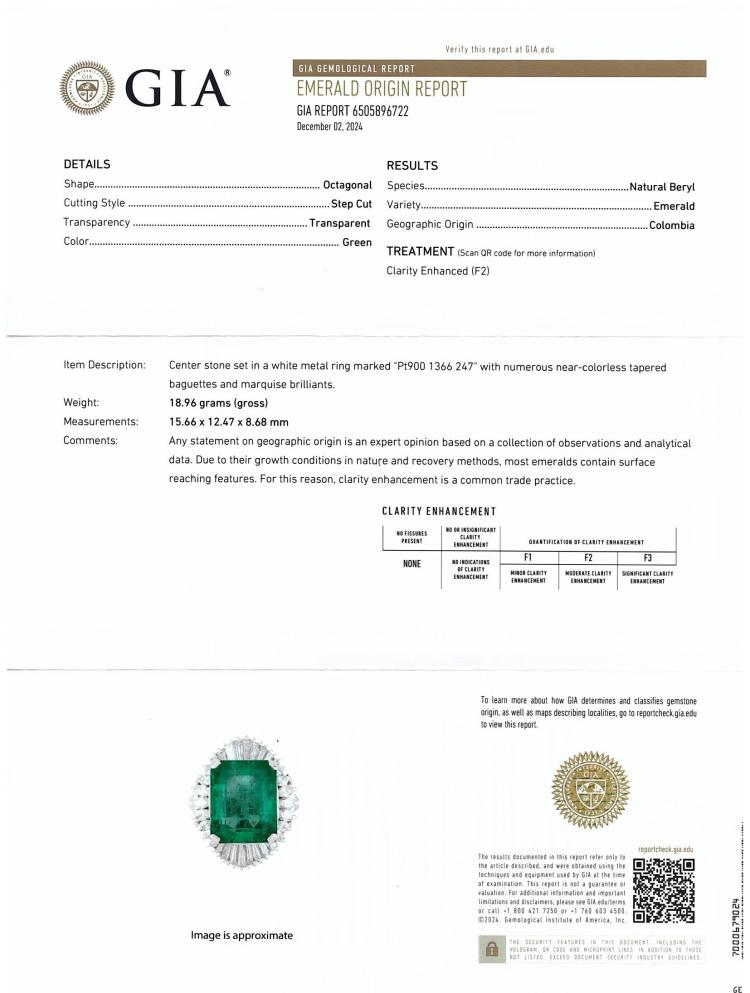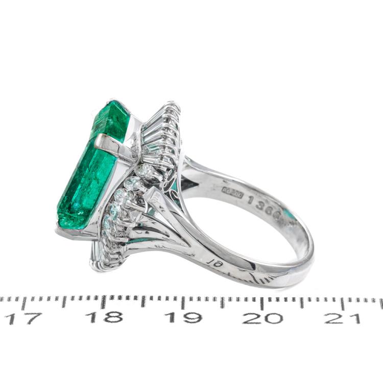 Emerald and Diamond ring with an octagonal step cut Colombian Natural Emerald of 13.66ct and baguette & marquise cut Natural Diamonds totalling 2.47ct (Estimated grading: H-I SI). Platinum 900. Ring size Q. Band width: 3.5mm-4.0mm. Weight: 18.9g. With GIA Emerald Origin Report #6505896722. (Pre-owned)
