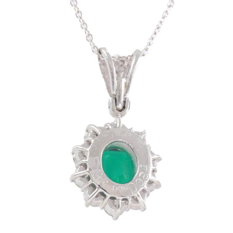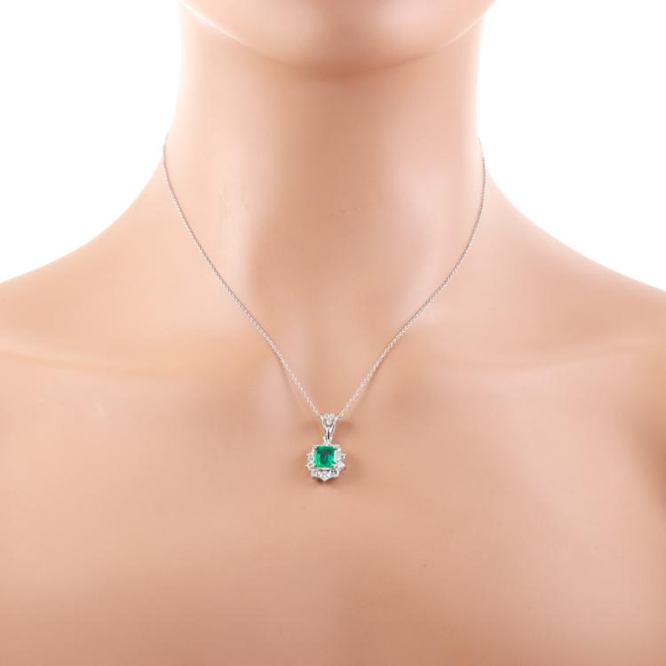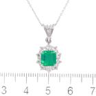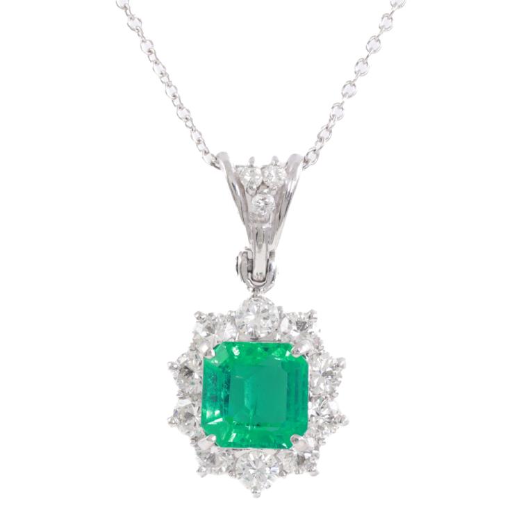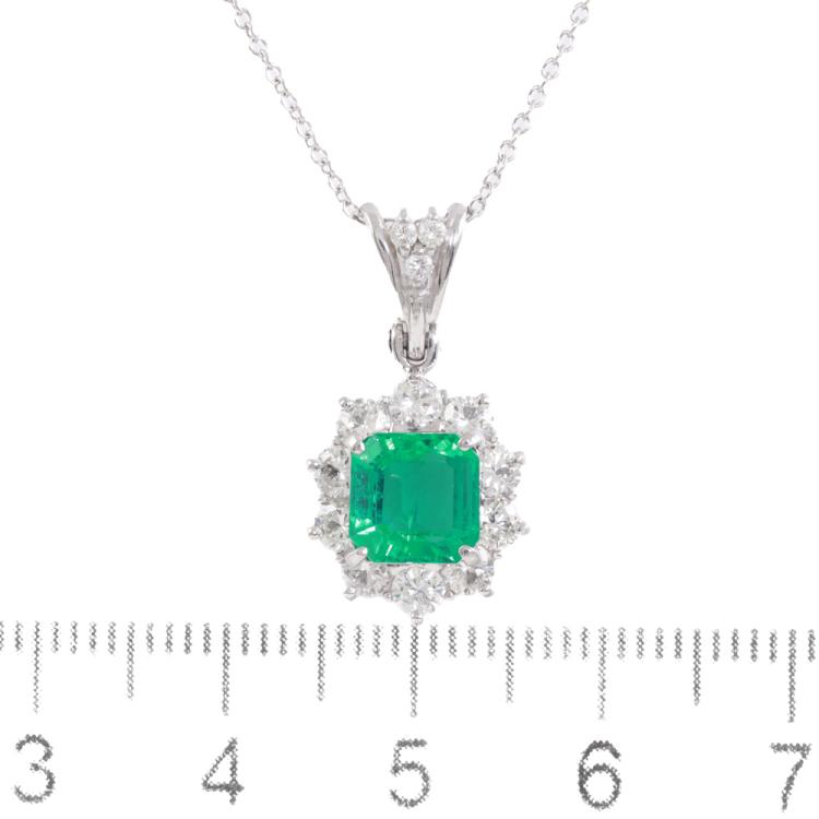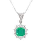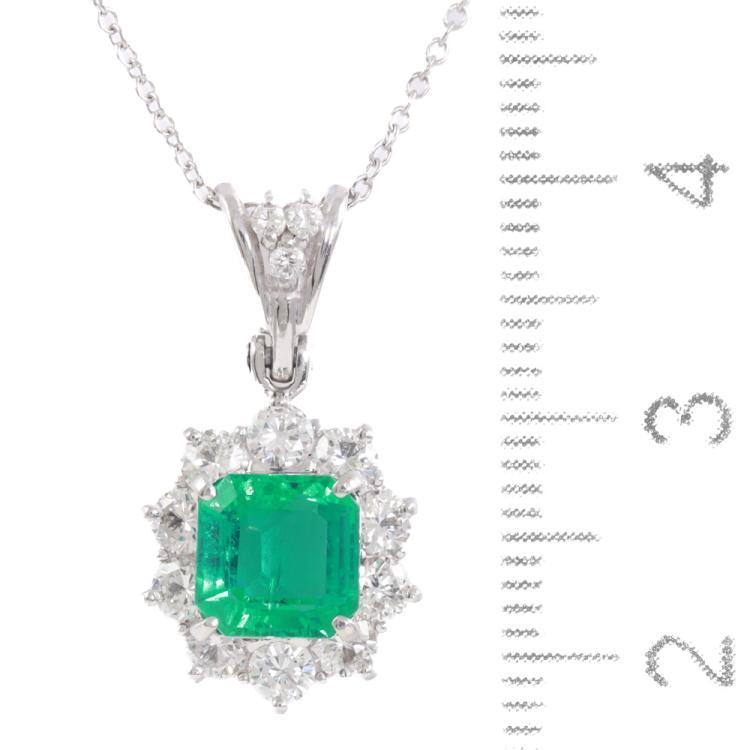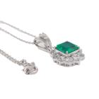 Emerald and Diamond pendant with square emerald cut Natural Emerald of 1.36ct and round Natural Diamonds totalling 0.84ct (Estimated grading: G-H VS-SI). Platinum - 850 with 18ct white gold 40cm chain. Weight: 5.2g. With Certificate #419171. (Pre-owned)