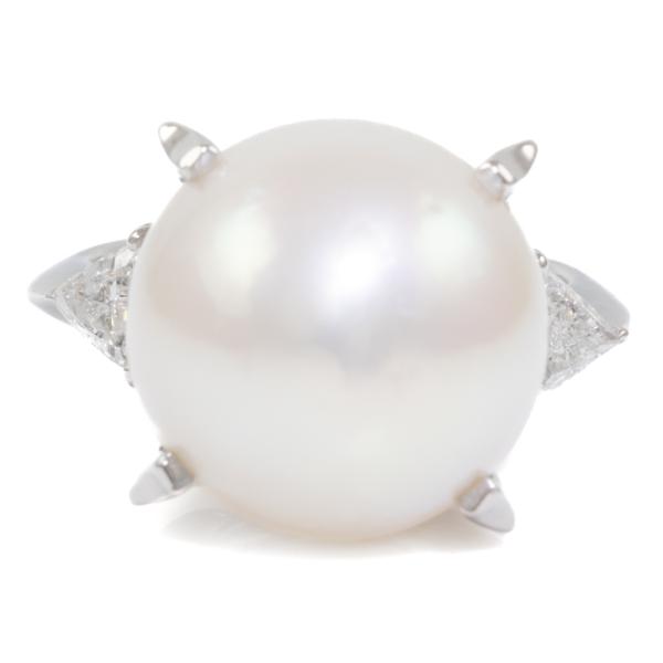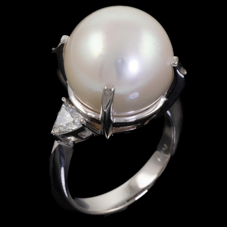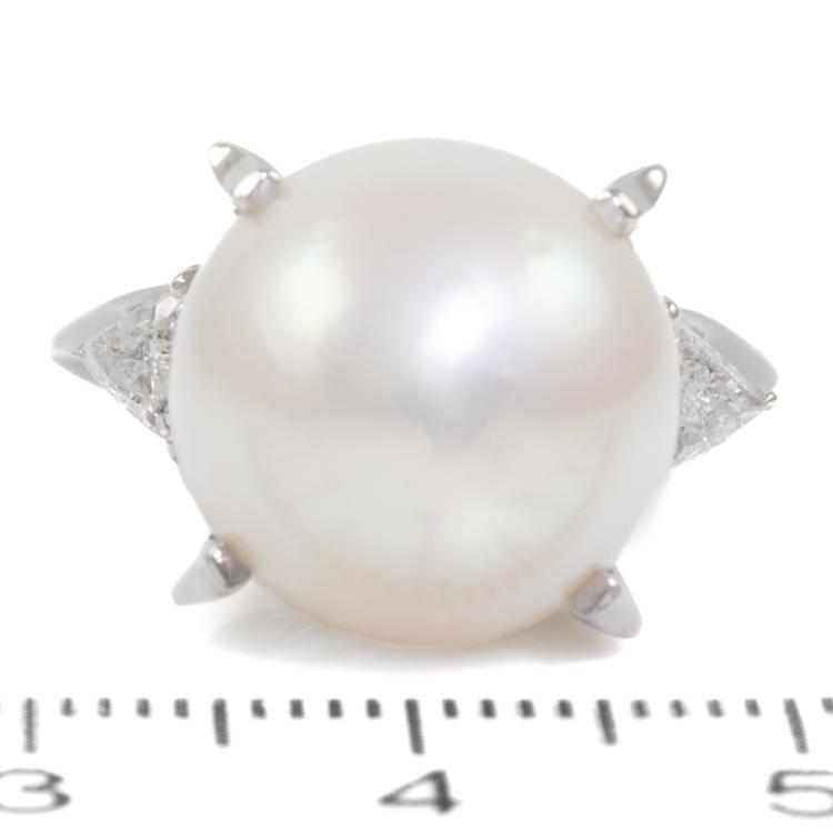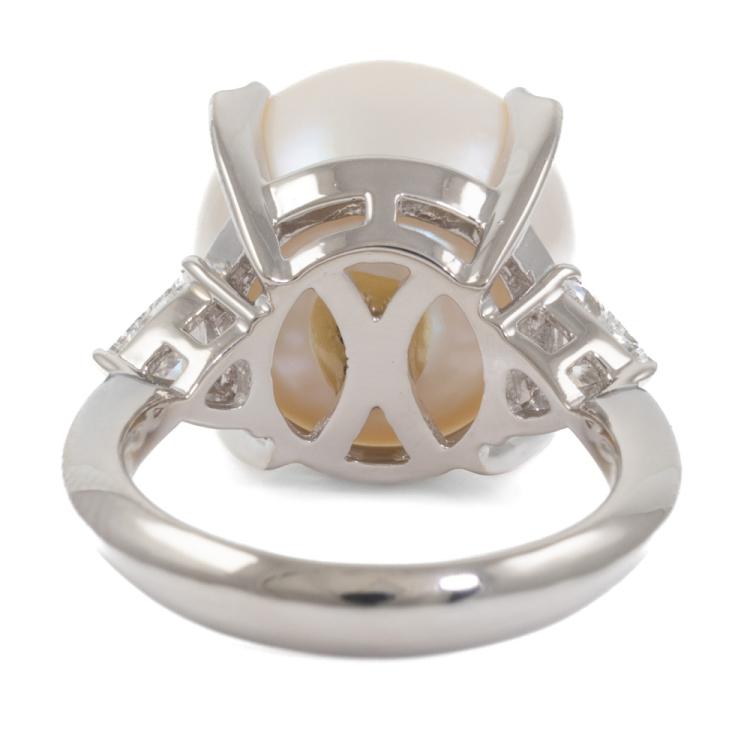 Pearl and Diamond ring with South Sea Pearl of 13.6mm and natural Diamonds totalling 0.32ct (Estimated grading: H SI). Platinum 900. Ring size K. Band width: 3.5mm - 1.6mm. Weight: 11.5g. (Pre-owned)