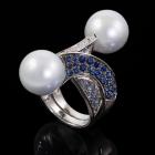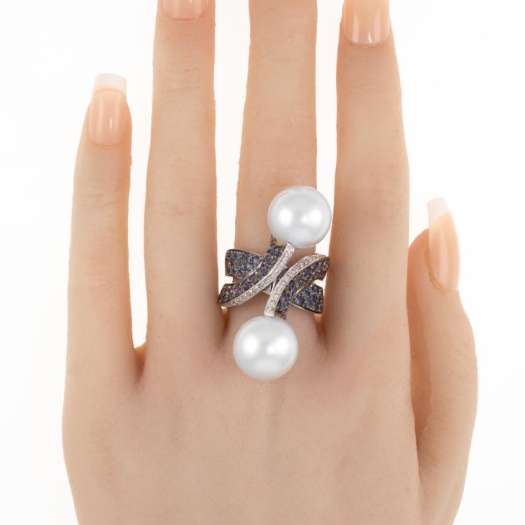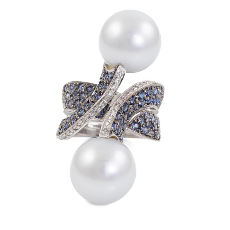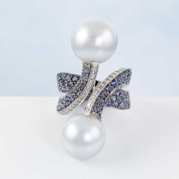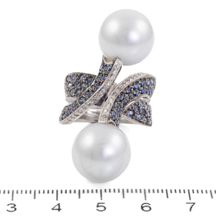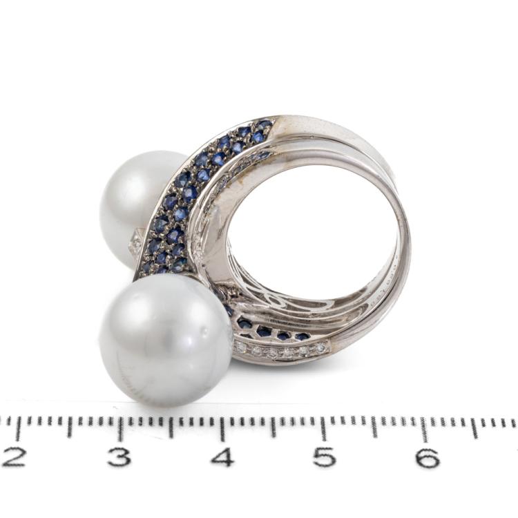 Pearl, Sapphire and Diamond ring with South sea pearls of 13.4mm & 13.7mm, round Natural blue Sapphires totalling 2.27ct and round Natural Diamonds totalling 0.31ct. (Estimated grading: H-I SI). 18ct white gold. Ring size N - ring resizing is not recommended. Band width: approx. 6.5mm-12.4mm. Weight: 22.5g. With Certificate: #419004 (Pre-owned)