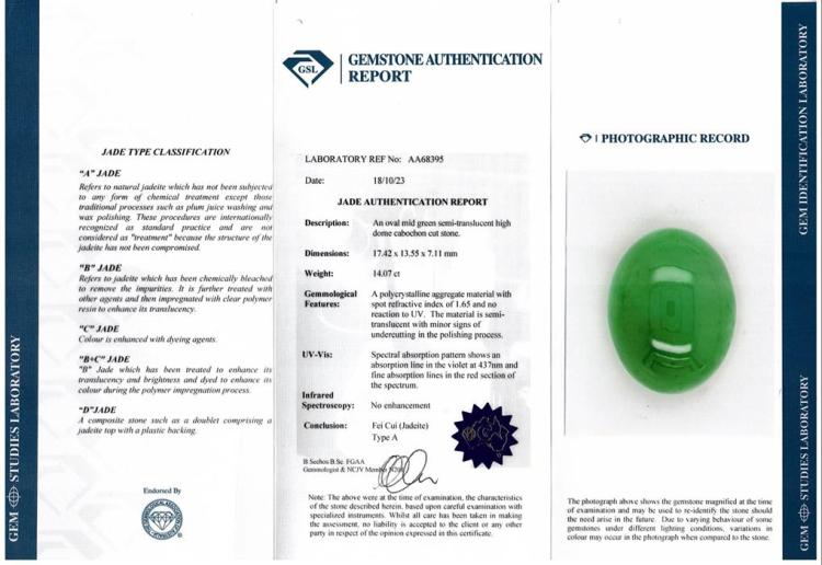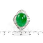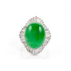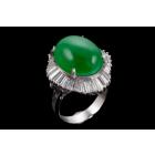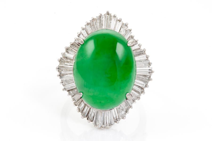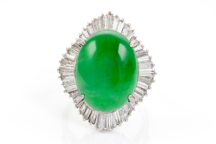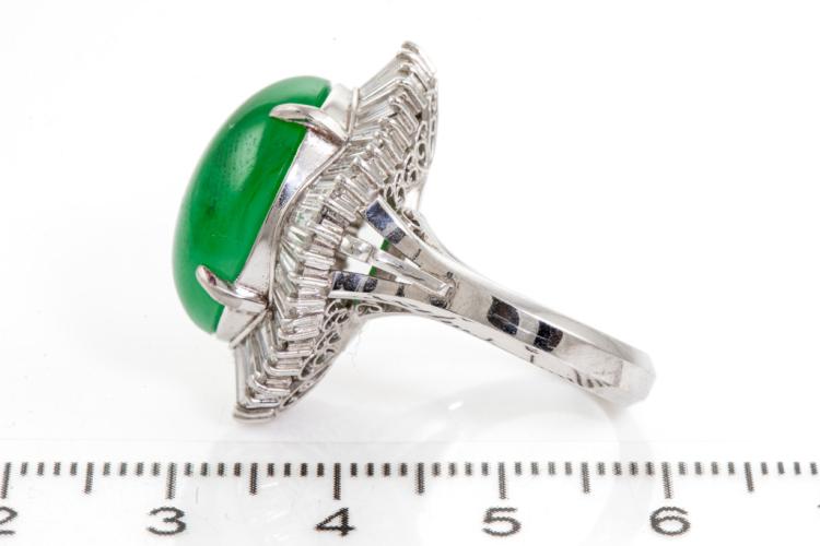Jade and Diamond ring with oval cabochon cut Natural Jadeite - Type A of 14.07ct (With GSL Report #AA68395) and baguette cut Natural Diamonds totalling 2.06ct (Estimated grading: G-H SI). Platinum 900. Ring size L. Band width: 3.80mm - 3.60mm. Weight: 15.6g. (Pre-owned)