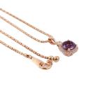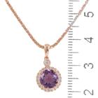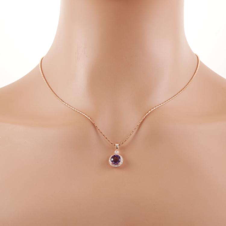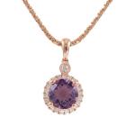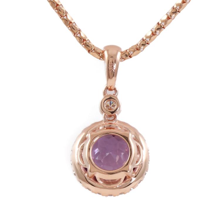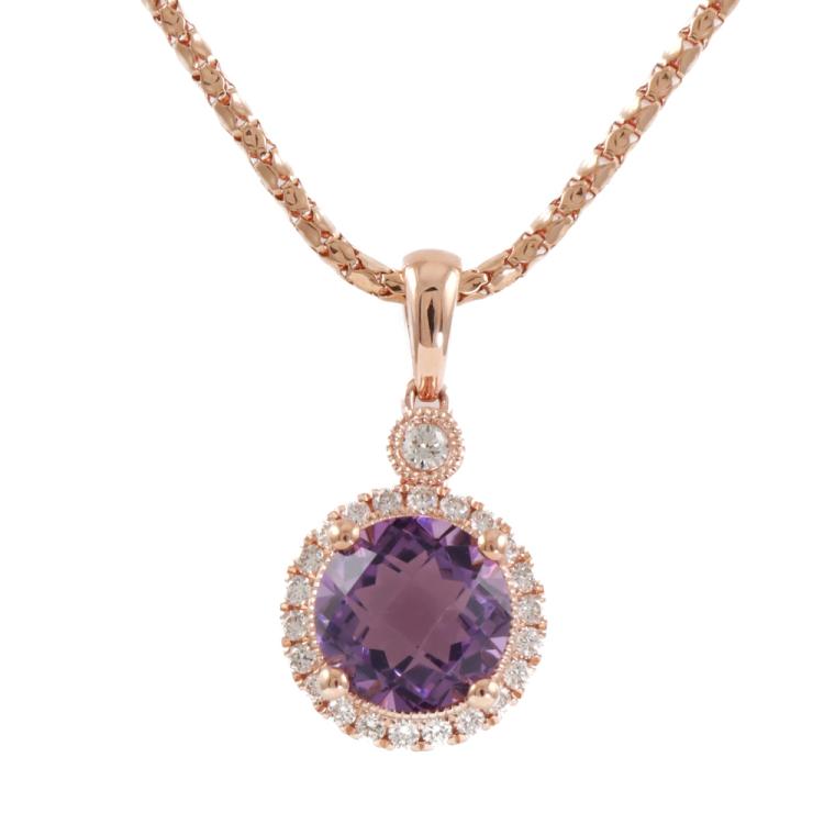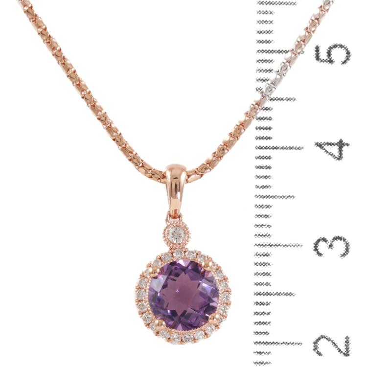 Amethyst and Diamond pendant with a round Natural Amethyst of 1.43ct and round Natural Diamonds totalling 0.15ct. 14ct rose gold with 18ct rose gold adjustable 45.5cm chain. Weight: 4.2g. (New)