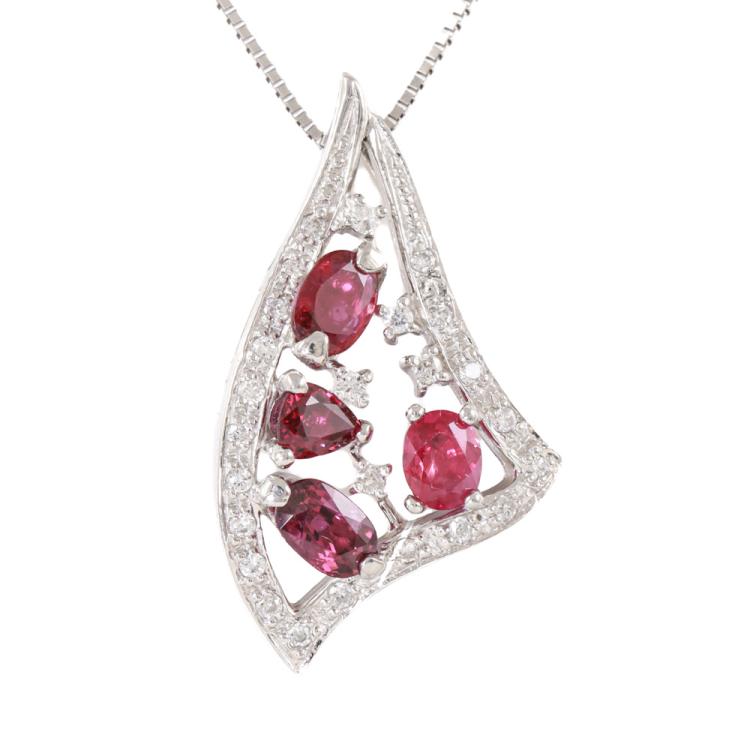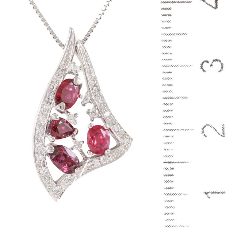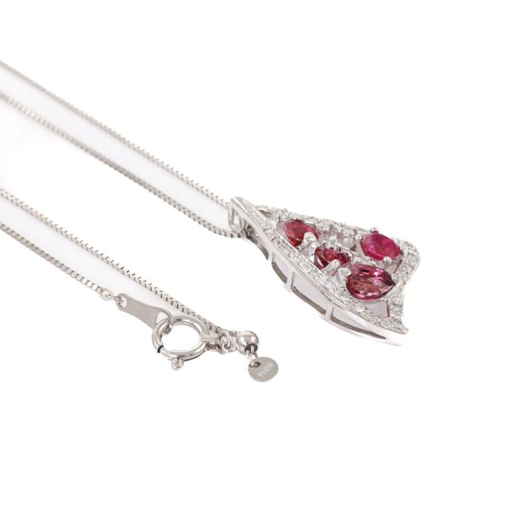 Ruby and Diamond pendant with oval shape & pear shape Natural Rubies totalling 1.43ct and round Natural Diamonds totalling 0.15ct. Platinum 950 with 45cm Platinum 850 adjustable chain. Weight: 6.4g. (Pre-owned)
