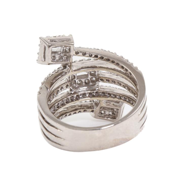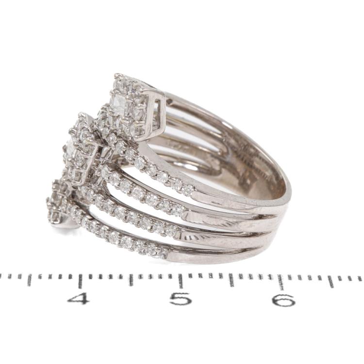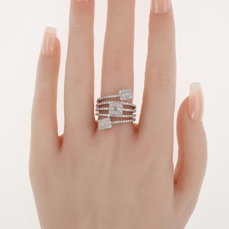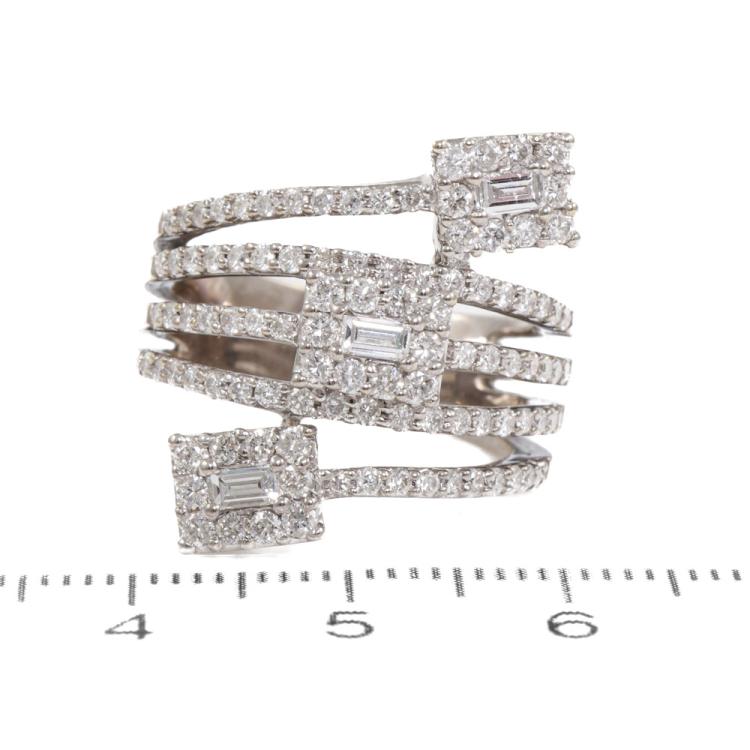 Diamond dress ring with round & baguette cut Natural Diamonds totalling 1.45ct (Estimated grading: G-H VS & H-I SI-P1). 18ct white gold. Ring size N - ring resizing is not recommended. Minimum band width: 5.4mm. Weight: 10.5g. (Pre-owned)