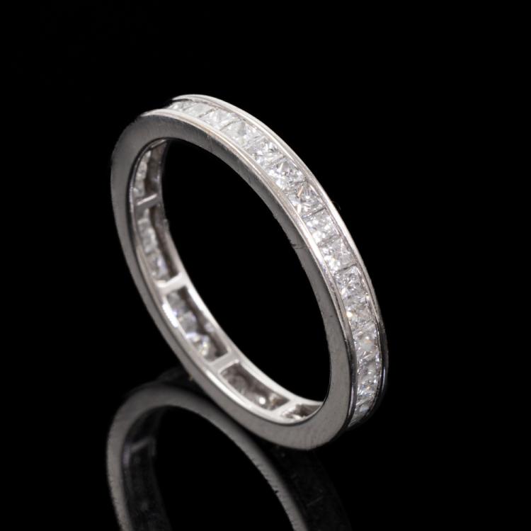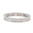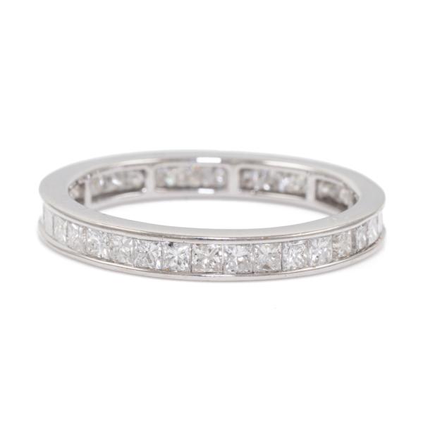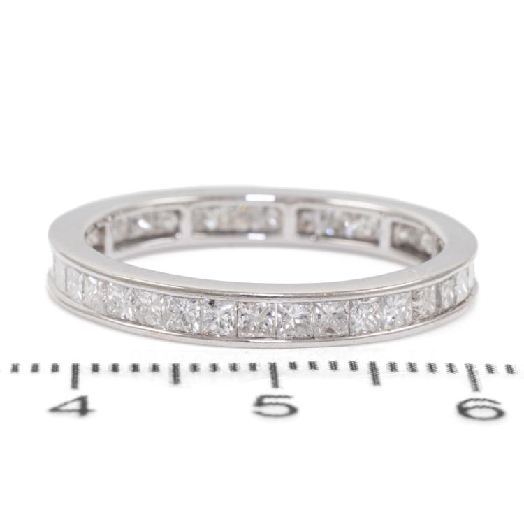 Diamond full hoop eternity ring with princess cut Natural Diamonds totalling 1.45ct (Estimated grading: H-I SI). 18ct white gold. Band width: 3.2mm. Ring size: S - ring resizing is not recommended. Weight: 3.0g (Pre-owned)