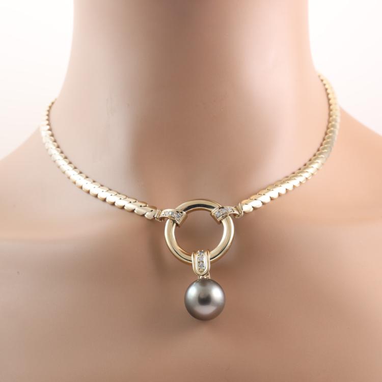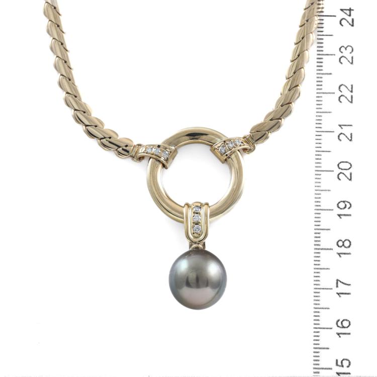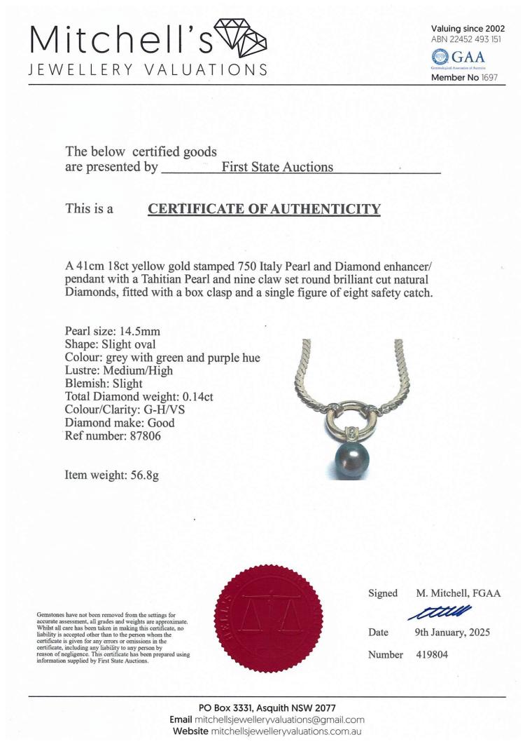 Diamond necklace with detachable pearl enhancer/pendant. With centre Tahitian pearl of 14.5mm and 9 round Natural Diamonds totalling 0.14ct. 18ct yellow gold with attached 18ct yellow gold chain. Length: 41cm. Weigh: 56.8g. With Certificate #419804. (Pre-owned)