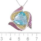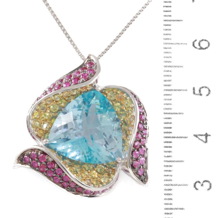 Topaz and Diamond pendant with trilliant cut blue Natural Topaz of 14.68ct and round Natural Rubies & Natural yellow Sapphires totalling 2.33ct. 18ct white gold with adjustable 45cm 18ct white gold chain. Weight: 13.8g. (Pre-owned)