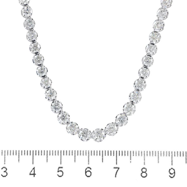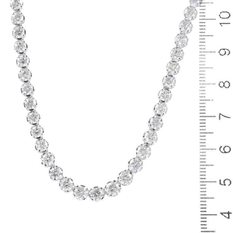 Diamond tennis necklace with 94 round Natural Diamonds totalling 14.76ct (Estimated grading: I-J SI). 14ct white gold. Length: 40.5cm. Weight: 14.2g. With Valuation Certificate #419707. (New)