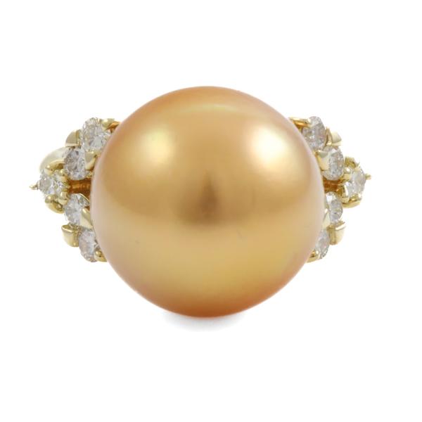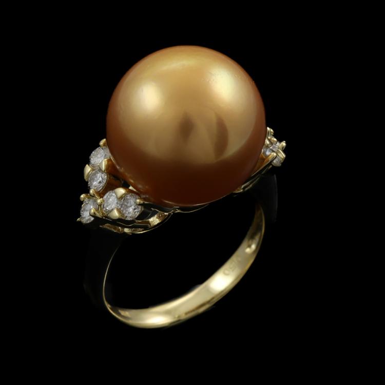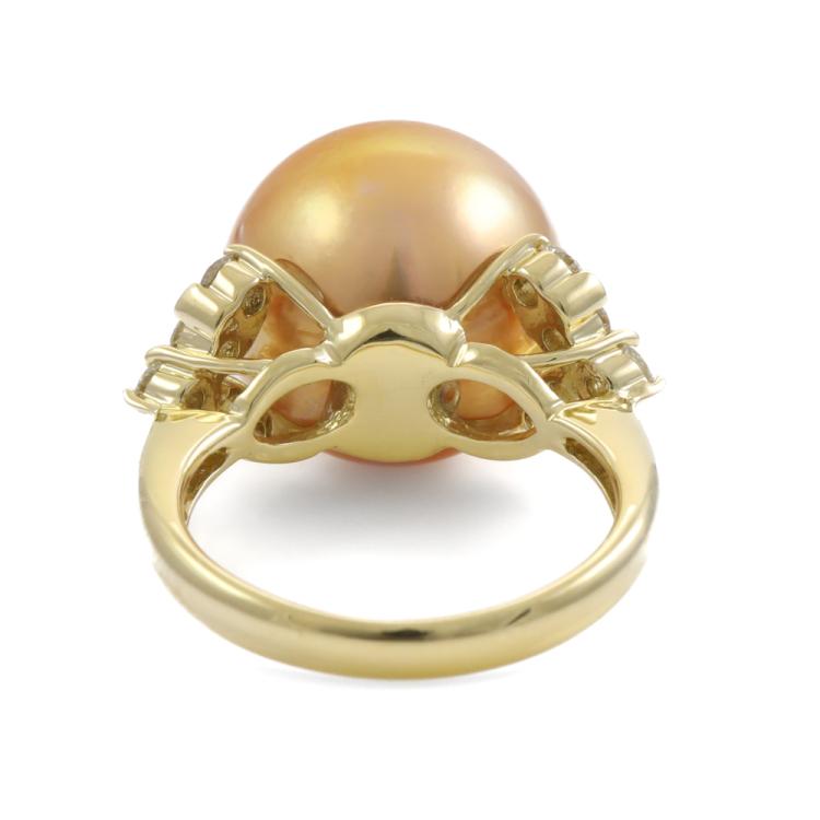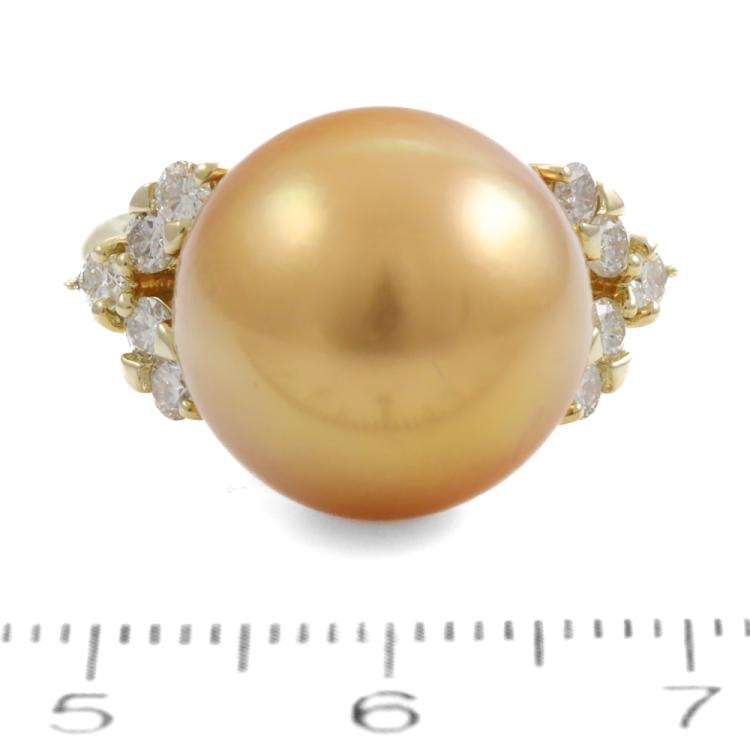 Pearl and Diamond ring with Golden South Sea Pearl of 14.7mm and round Natural Diamonds totalling 0.50ct (Estimated grading I-J SI-P1) . 18ct yellow gold . Ring size L. Band width: 2.8mm - 2mm. Weight: 9.4g. (Pre-owned)