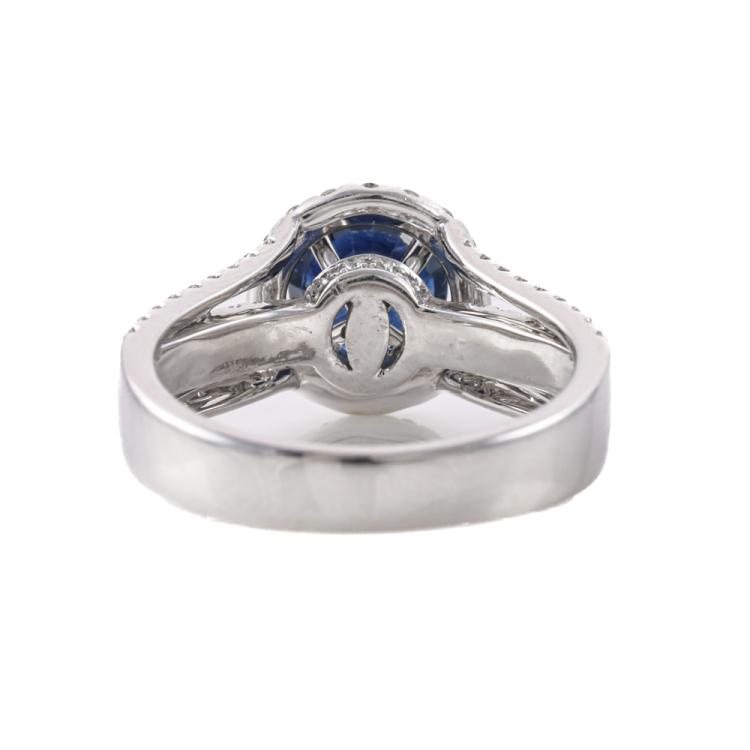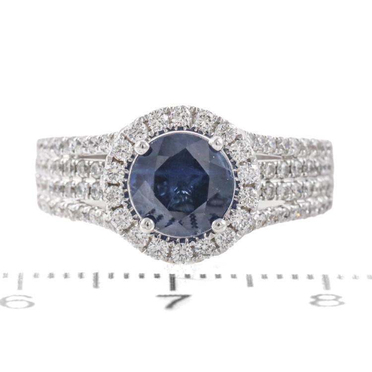 Sapphire and Diamond ring with a round dark blue Natural Sapphire of approximately 1.50ct and round Natural Diamonds totalling 0.75ct (Estimated grading: I-J SI). 18ct white gold. Ring size M1/2. Band width: 3.6mm-5mm. Weight: 6.0g. (Pre-owned)